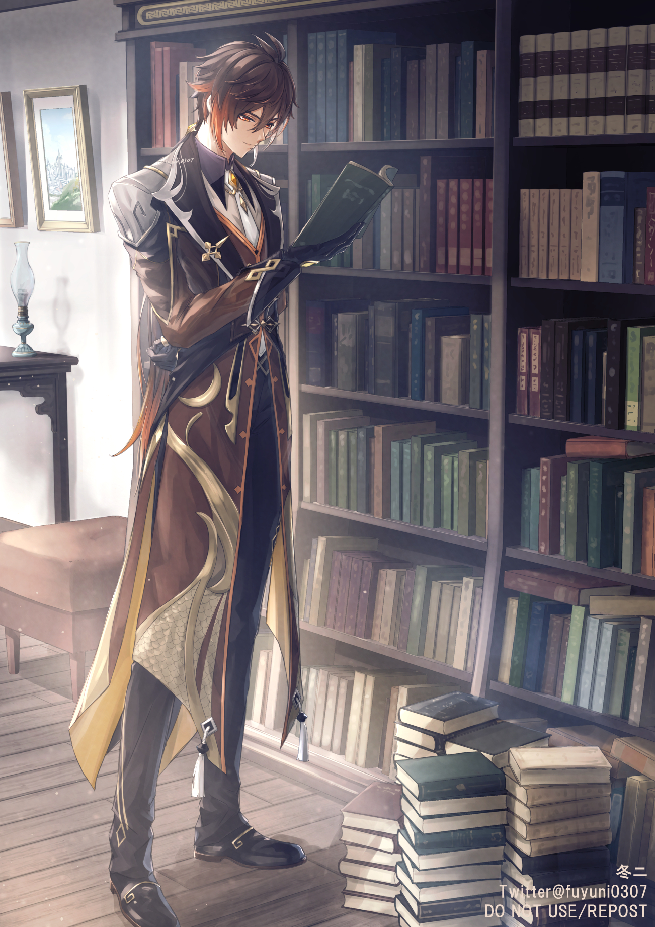 1boy arm_behind_back black_gloves black_shoes book book_stack brown_hair closed_mouth coattails collared_shirt commentary eyeliner formal_clothes full_body fuyuni0307 genshin_impact gloves gradient_hair hair_between_eyes highres holding holding_book jacket lamp long_hair long_sleeves low_ponytail makeup male_focus multicolored_hair necktie orange_hair painting_(object) pants ponytail shelf shirt shoes smile solo standing suit table tailcoat twitter_username white_necktie wooden_floor wooden_table yellow_eyes zhongli_(genshin_impact)