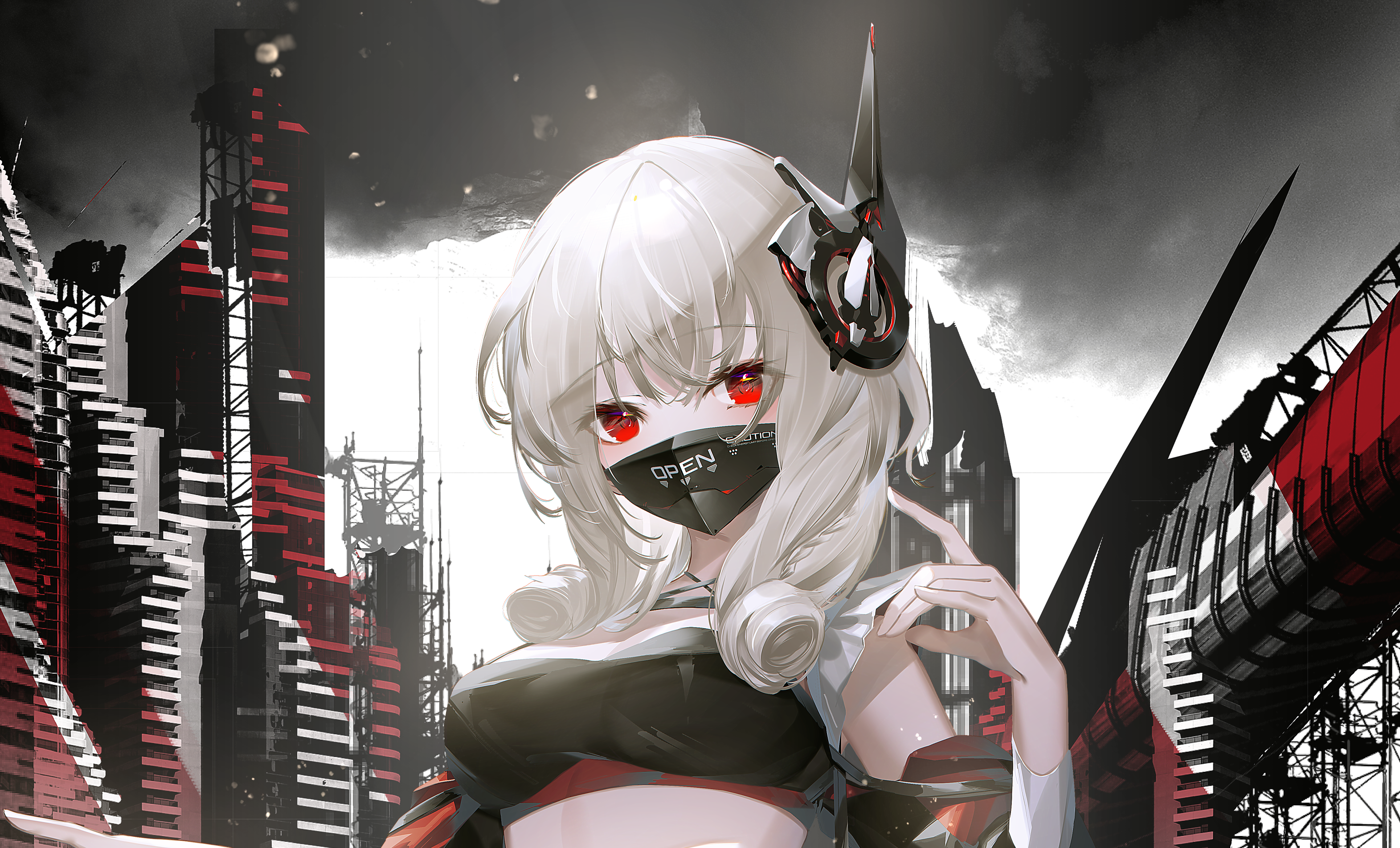 1girl alternate_costume azur_lane breasts building city cloud cloudy_sky crop_top drill_hair drill_sidelocks hand_up headgear highres ka11_ca limited_palette long_hair long_sleeves luetzow_(azur_lane) mask medium_breasts mouth_mask red_eyes sidelocks sky solo standing upper_body white_hair