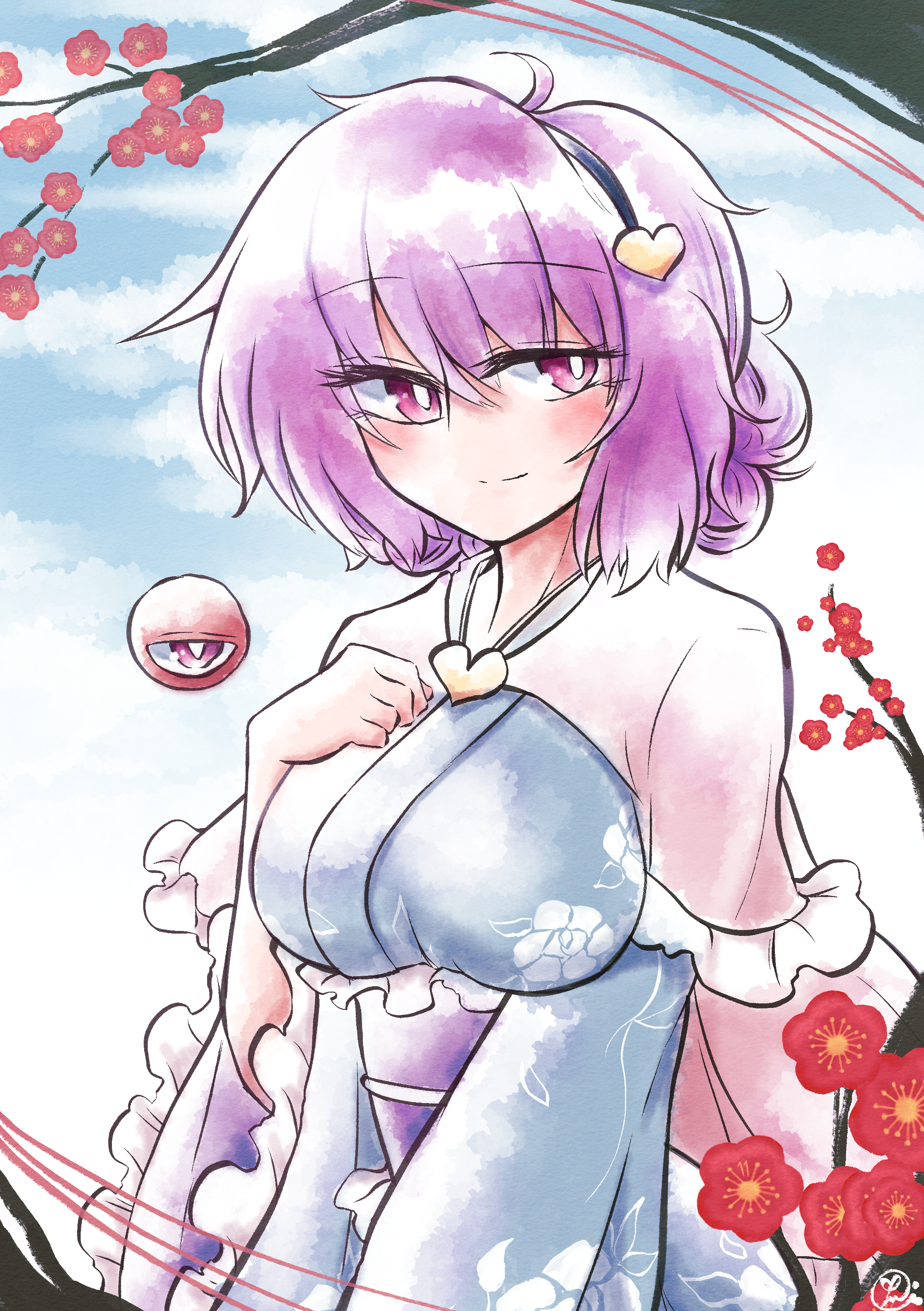 1girl absurdres blue_kimono blue_sky breasts capelet closed_mouth cloud cloudy_sky commentary_request eyeball floral_print flower frilled_sleeves frills hair_between_eyes hand_on_own_chest highres japanese_clothes kimono komeiji_satori large_breasts long_sleeves looking_at_viewer outdoors pink_capelet print_kimono purple_eyes purple_hair red_flower scavia10 sky smile solo third_eye touhou upper_body wide_sleeves