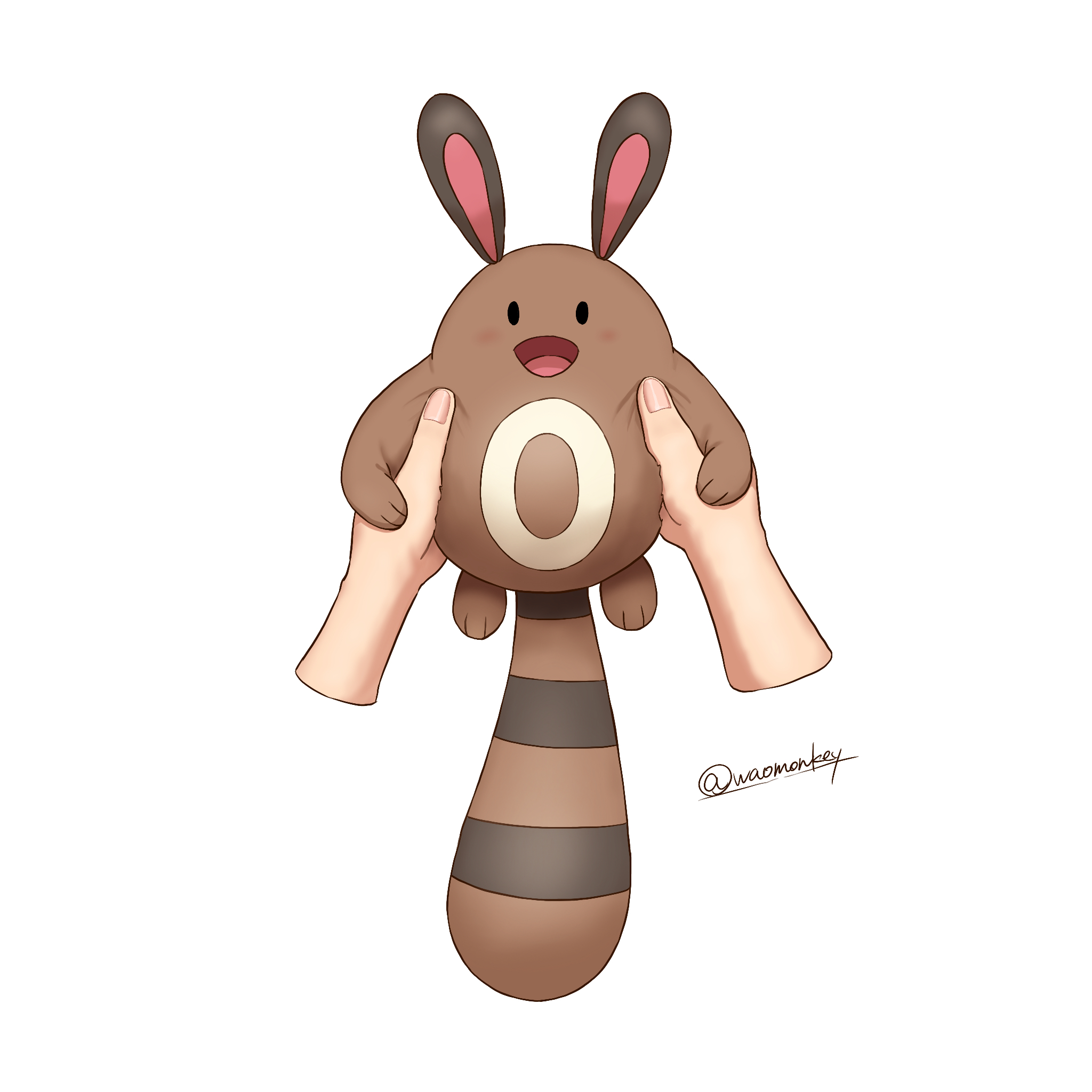 :d black_eyes blush commentary_request creature disembodied_hand fingernails gen_2_pokemon highres looking_at_viewer nintendo open_mouth pokemon pokemon_(creature) sentret simple_background smile solid_oval_eyes tongue twitter_username waomonkey white_background
