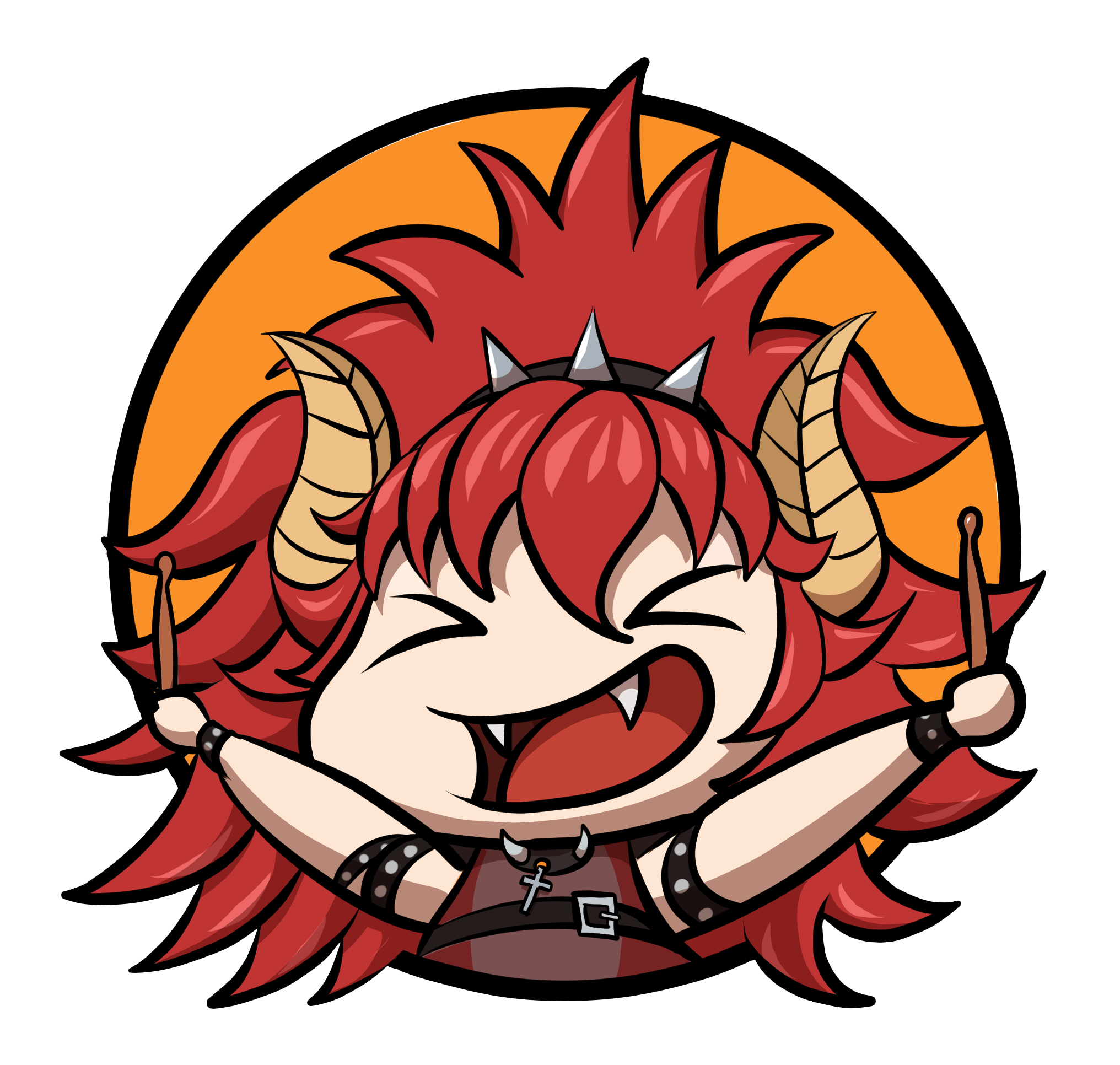 1girl chibi closed_eyes dragon_girl dragon_horns drumsticks fangs highres horns red_hair sparkle virtual_youtuber vshojo white_background zentreya