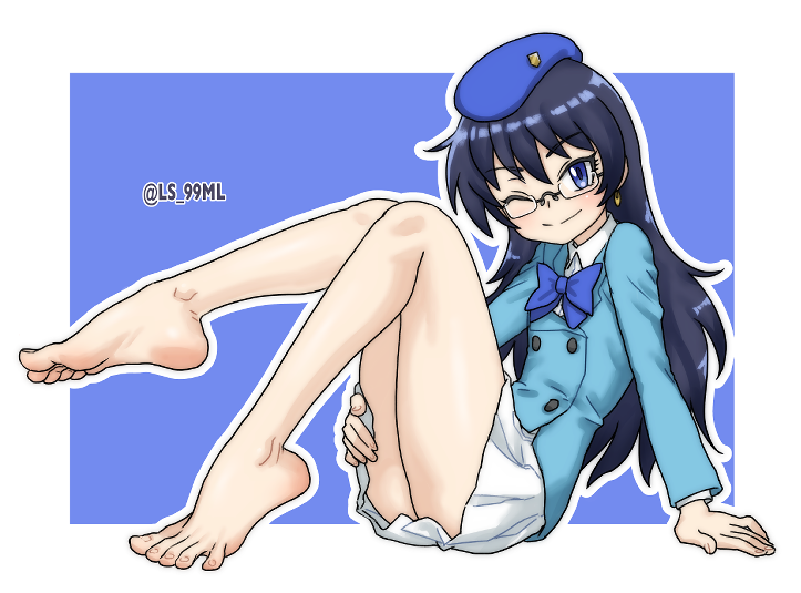 1girl barefoot black_hair blue_eyes feet foot_focus glasses long_hair looking_at_viewer nogami_aoi one_eye_closed skirt smile soles solo toes tsukimaru_(ls_99ml) zettai_karen_children