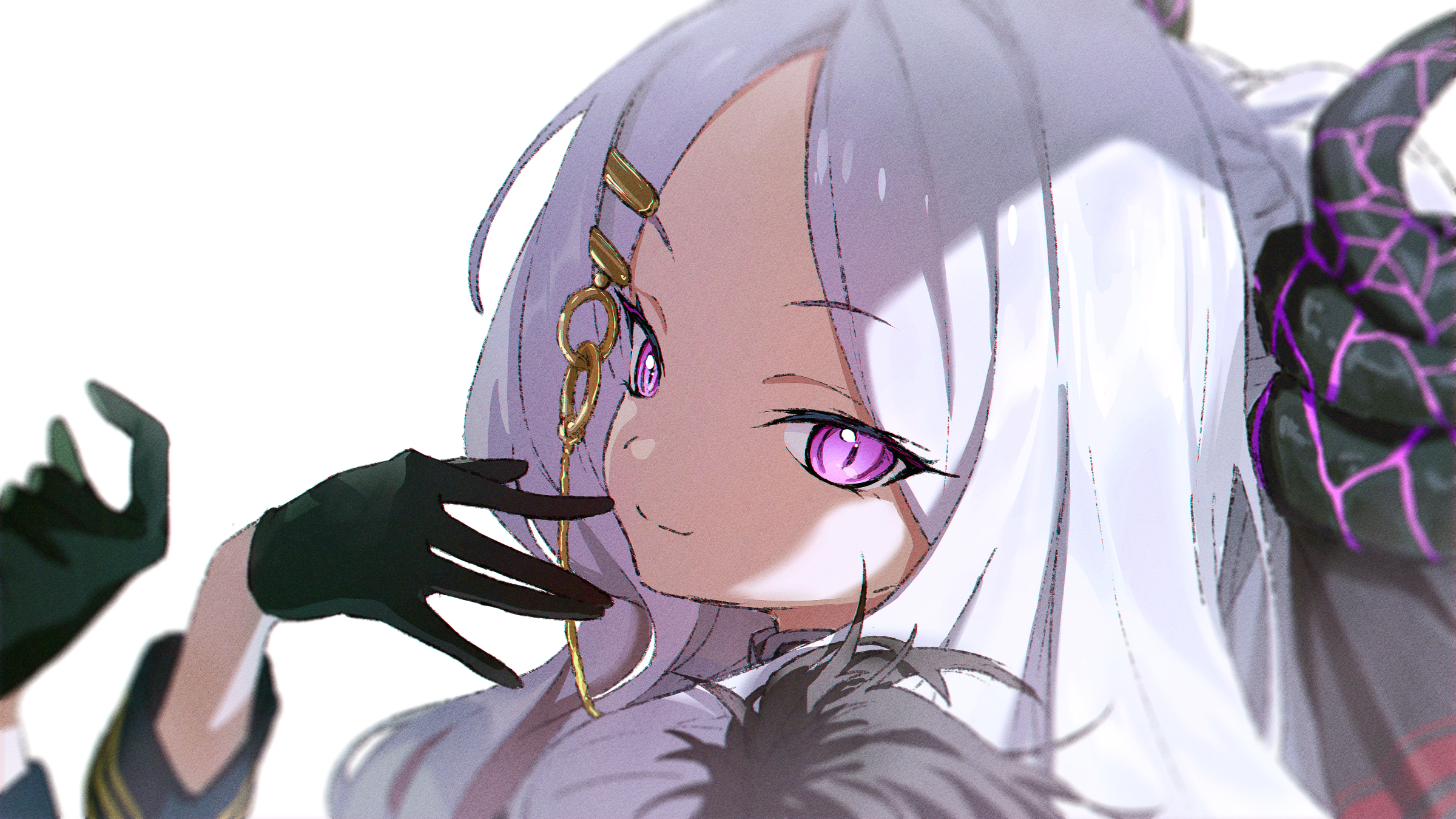 1girl black_gloves blue_archive blurry commentary_request demon_girl demon_horns depth_of_field eyes_visible_through_hair forehead fur_trim gloves hair_ornament hairclip highres hina_(blue_archive) horns long_hair long_sleeves looking_at_viewer parted_bangs purple_eyes sidelocks simple_background smile solo white_background white_hair yakumo_crack