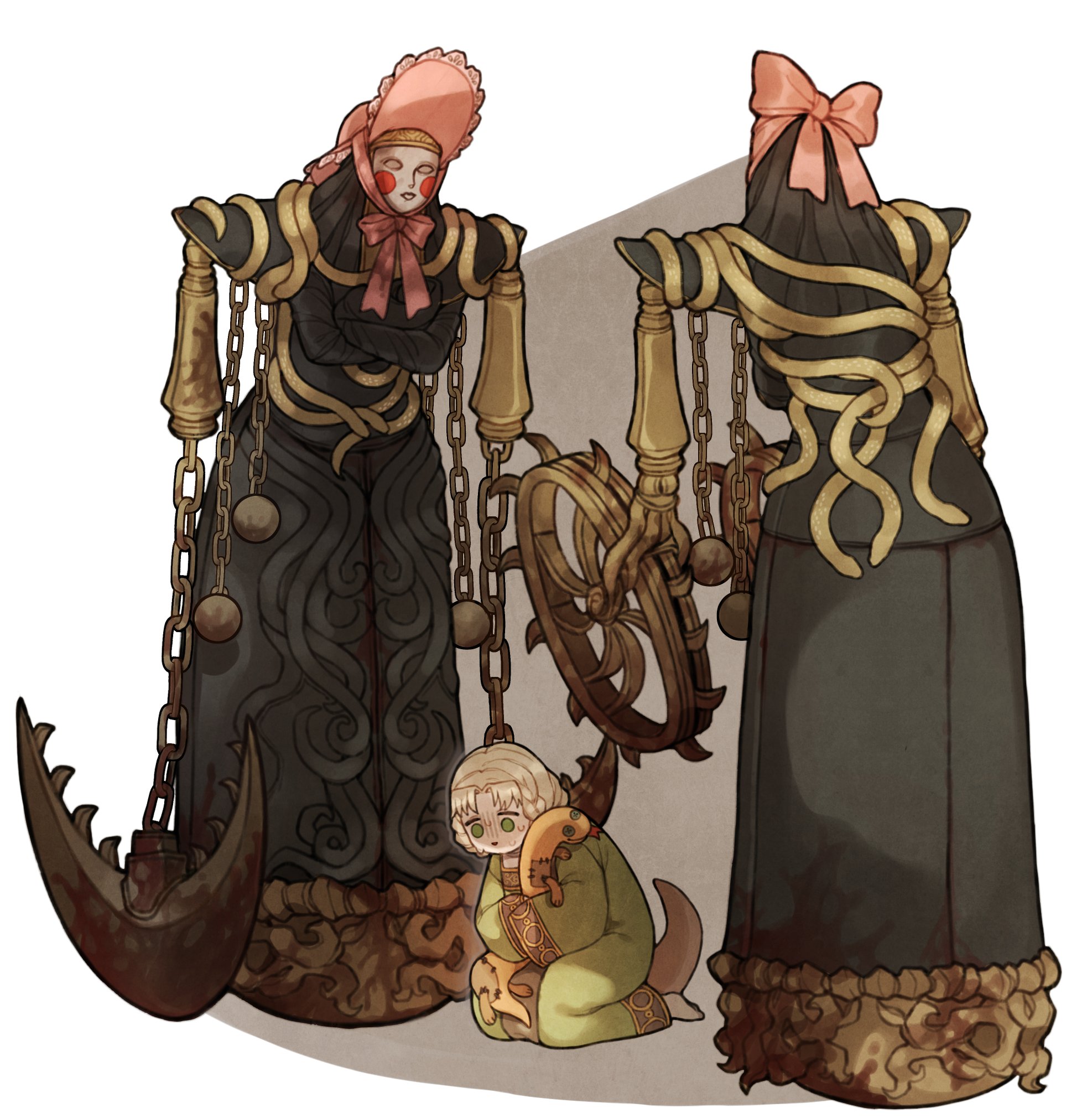 1girl abductor_virgin blonde_hair dress green_eyes highres iron_virgin_(elden_ring) noru0217 rya_(elden_ring) scared shadow stuffed_animal stuffed_toy sweatdrop