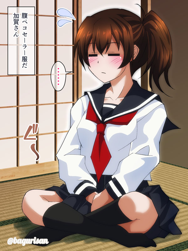 ... 1girl akichin_(atelier_baguri) black_socks black_skirt brown_hair closed_eyes indian_style kaga_(kancolle) kantai_collection kneehighs long_hair long_sleeves miniskirt neckerchief pleated_skirt red_neckerchief school_uniform serafuku shirt short_side_ponytail side_ponytail sitting skirt socks solo speech_bubble spoken_ellipsis translation_request white_shirt