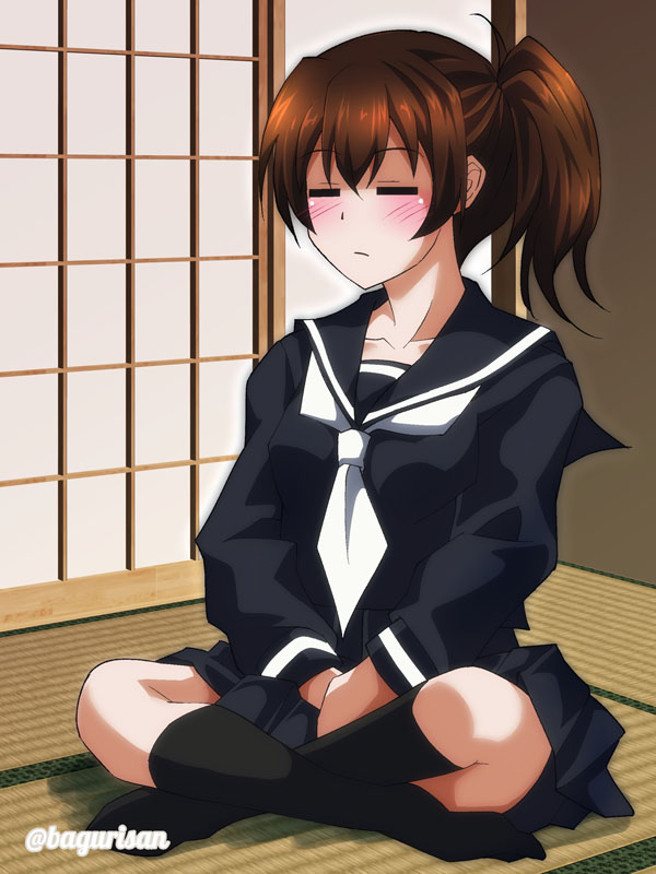 1girl akichin_(atelier_baguri) black_socks black_serafuku black_shirt black_skirt brown_hair closed_eyes indian_style kaga_(kancolle) kantai_collection kneehighs long_hair long_sleeves miniskirt necktie pleated_skirt school_uniform serafuku shirt short_side_ponytail side_ponytail sitting skirt socks solo white_necktie