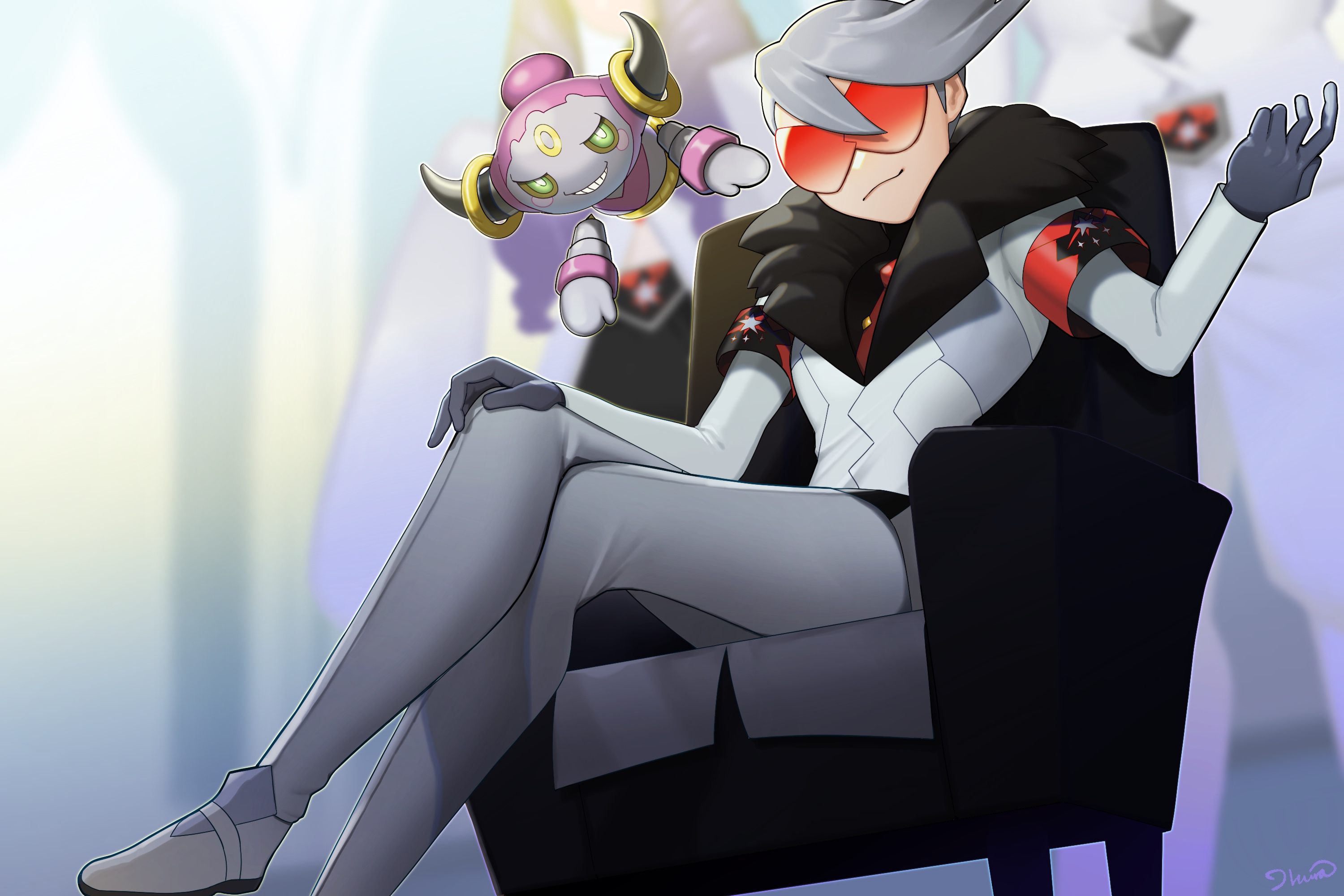 1boy armband black_shirt blurry chair coat commentary_request crossed_legs from_below fur-trimmed_coat fur_trim gen_6_pokemon gloves grey_gloves highres hoopa hoopa_(confined) ikura_(downdexp) lear_(pokemon) legendary_pokemon long_sleeves male_focus mythical_pokemon necktie nintendo pants pokemon pokemon_(creature) pokemon_masters_ex red_necktie shirt shoes sitting sunglasses white_coat white_footwear white_pants