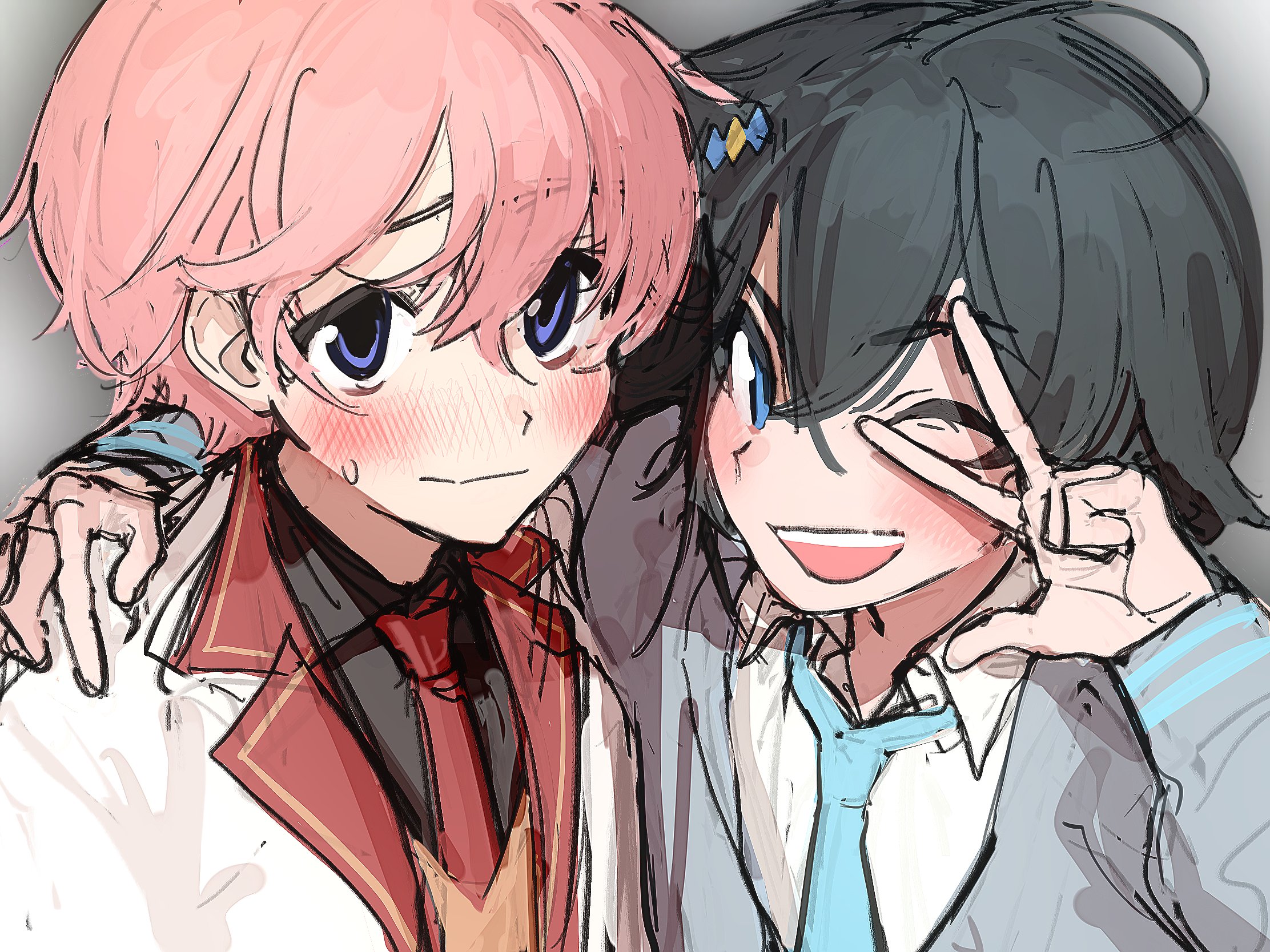 2boys ahoge aqua_necktie arm_around_shoulder black_hair blue_eyes blush closed_mouth commentary genderswap genderswap_(ftm) grey_background haaksik hair_between_eyes hair_ornament highres jacket long_sleeves looking_at_viewer male_focus multiple_boys necktie nijisanji one_eye_closed open_mouth pink_hair red_necktie simple_background sketch sorahoshi_kirame sorahoshi_kirame_(1st_costume) suo_sango suo_sango_(1st_costume) sweat untranslatable_commentary virtual_youtuber w w_over_eye