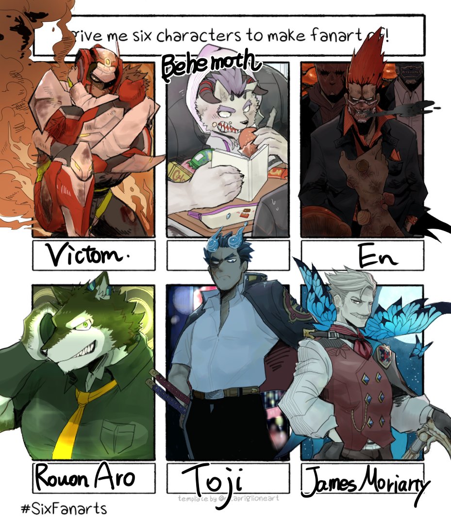 6+boys behemoth_(housamo) belt black_shirt blouse blue_eyes blue_fire book bug butterfly closed_mouth collared_shirt commentary_request dorohedoro ear_piercing eating en_(dorohedoro) facial_hair facial_scar fangs fangs_out fate/grand_order fate_(series) fiery_horns fire forked_eyebrows formal_clothes furry furry_male gakuran gloves green_eyes grey_hair helmet holding holding_book hood hoodie horns insect james_moriarty_(archer)_(fate) katana live_a_hero long_sleeves looking_at_viewer male_focus mask multiple_boys multiple_drawing_challenge multiple_swords muscular muscular_male mustache necktie no_eyebrows open_mouth piercing red_hair rouon_aro sakimori_toji scar scar_on_cheek scar_on_face school_uniform sharp_teeth shirt short_hair six_fanarts_challenge smile snack spiked_hair suit sweatdrop sword teeth thick_eyebrows tokyo_houkago_summoners upper_body utau vest victom_(live_a_hero) wadanosuke_(waadaa_hmlh) weapon white_shirt yellow_necktie