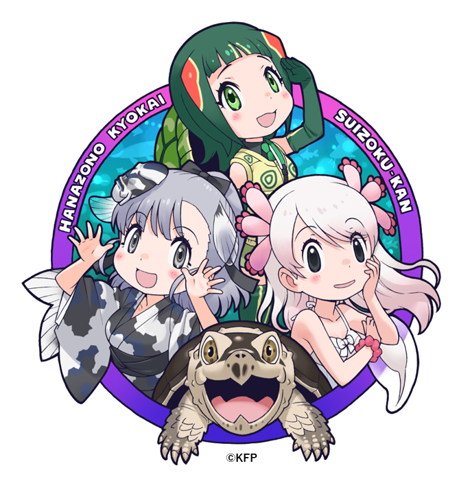 animal animal_costume black_eyes gloves green_eyes green_hair grey_eyes grey_hair hair_ornament japanese_clothes jinmen-gyo_(kemono_friends) kemono_friends kimono long_hair looking_at_viewer mexico_salamander_(kemono_friends) multiple_girls necktie official_art open_mouth pink_hair red-eared_slider_(kemono_friends) ribbon short_hair sleeveless smile turtle yoshizaki_mine