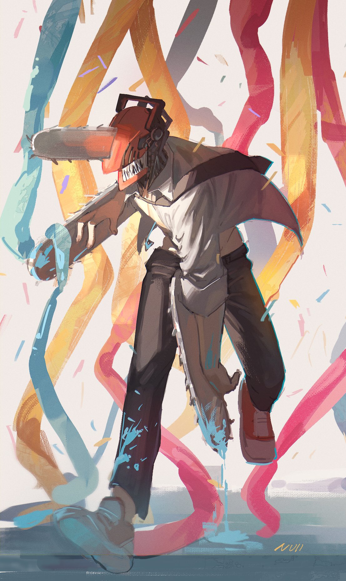 1boy black_necktie black_pants blood bloody_weapon chainsaw chainsaw_man confetti denji_(chainsaw_man) full_body highres hybrid necktie null_(skev7724) pants puddle red_footwear running sharp_teeth simple_background solo stylized_blood teeth water weapon white_background