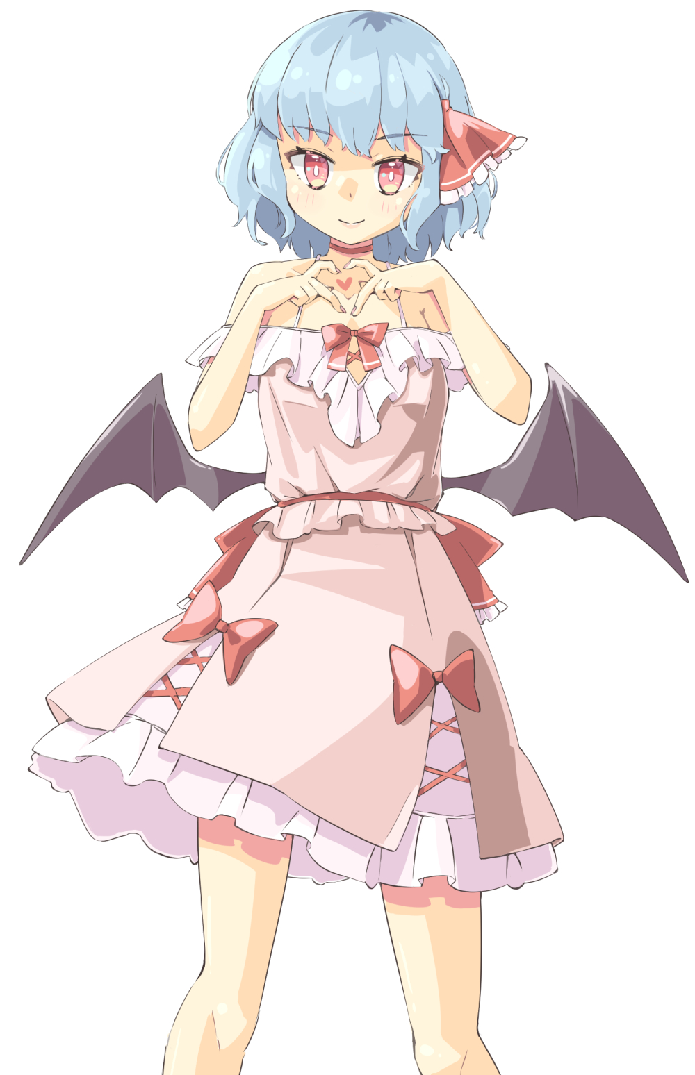 1girl adapted_costume arnest bat_wings black_wings blue_hair blush closed_mouth dress feet_out_of_frame hair_between_eyes heart heart_hands highres pink_dress red_eyes remilia_scarlet short_hair simple_background smile solo touhou white_background wings