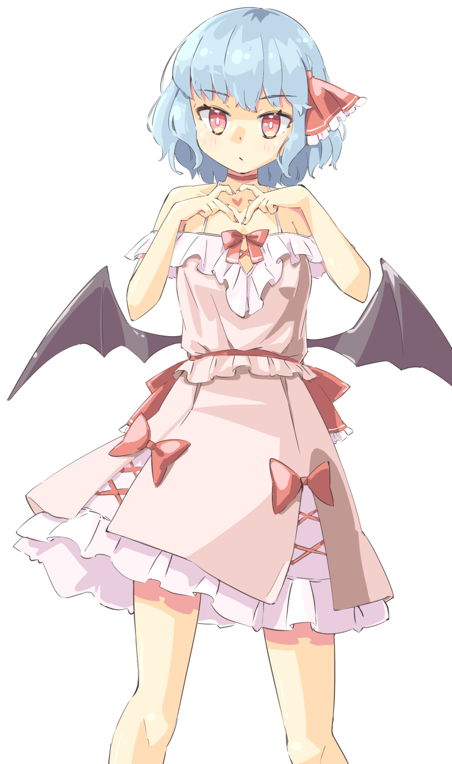 1girl :/ adapted_costume arnest bare_shoulders bat_wings black_wings blue_hair bow bright_pupils choker closed_mouth cropped cross-laced_clothes dot_nose downscaled expressionless feet_out_of_frame frilled_ribbon frilled_shirt frills hair_ribbon hands_up heart heart_hands highres legs_apart light_blue_hair light_blush looking_at_viewer low_wings missing_headwear off-shoulder_shirt off_shoulder petticoat pink_shirt pink_skirt red_bow red_choker red_eyes red_ribbon red_sash remilia_scarlet resized ribbon sash shiny_skin shirt short_hair simple_background skirt skirt_set solo spaghetti_strap standing straight-on touhou tsurime white_background white_pupils wings