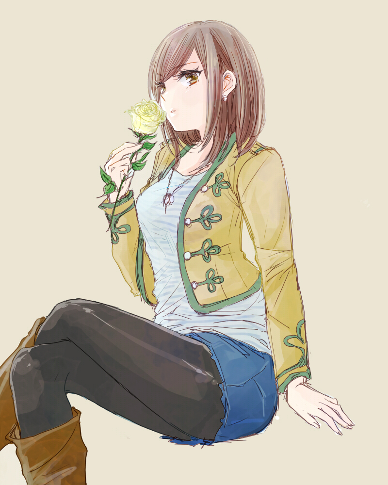 1girl boots brown_hair crossed_legs denim denim_shorts flower holding holding_flower jewelry kaizoku_sentai_gokaiger kelp_(artist) long_sleeves looking_at_viewer luka_millfy necklace orange_eyes rose short_hair shorts simple_background sitting solo super_sentai yellow_flower yellow_rose