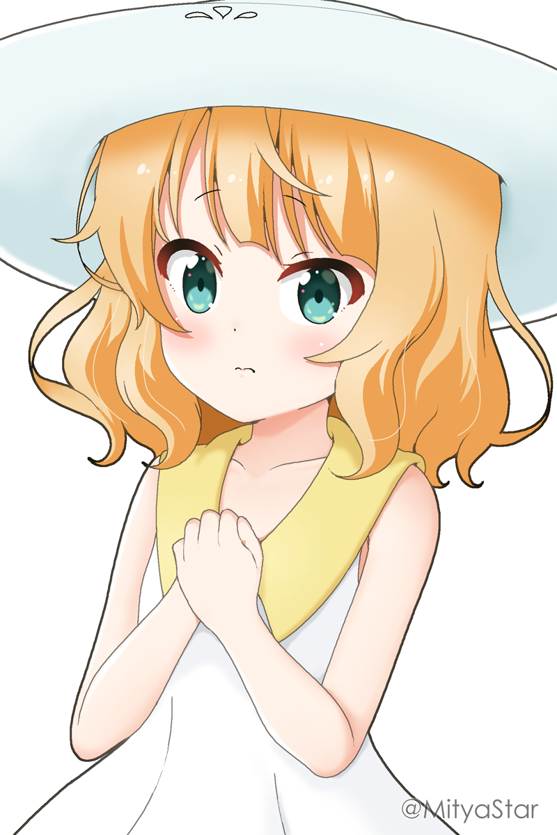 1girl bare_arms bare_shoulders blonde_hair blush closed_mouth collarbone commentary_request cosplay dress gochuumon_wa_usagi_desu_ka? green_eyes hands_up hat highres kirima_syaro lillie_(nihilego) lillie_(pokemon) lillie_(pokemon)_(cosplay) looking_at_viewer looking_away mitya nintendo own_hands_together pokemon pokemon_(anime) pokemon_journeys pokemon_swsh111 sleeveless sleeveless_dress solo sun_hat twitter_username wavy_mouth white_background white_dress white_hat