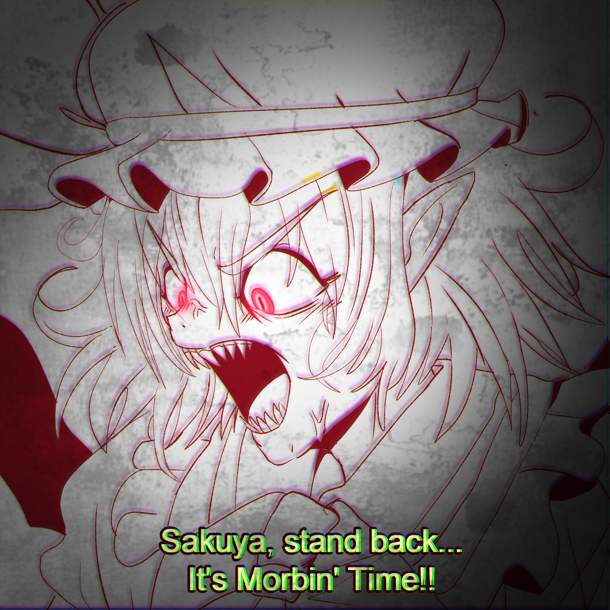 1girl bat_wings bow english_text fang glowing glowing_eyes hair_between_eyes hat highres it's_morbin'_time_(meme) marvel meme mob_cap monochrome morbius_(movie) open_mouth parody pointy_ears red_eyes remilia_scarlet sharp_teeth short_hair solo sony's_spider-man_universe spider-man_(series) step_arts subtitled teeth touhou vampire wings