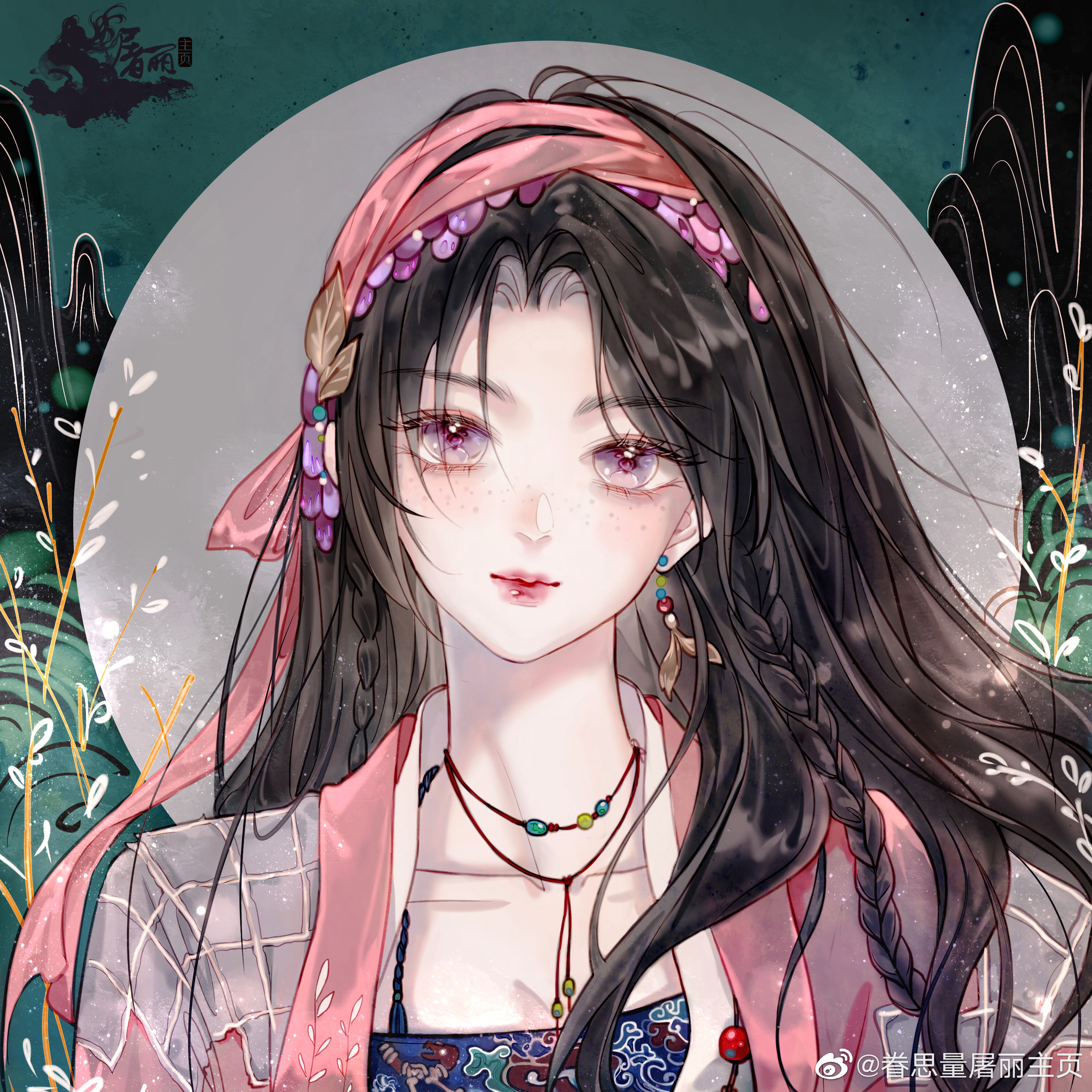 1girl absurdres braid brown_hair circle freckles hairband highres jewelry juan_silang_tu_li_zhuye juan_siliang long_hair looking_at_viewer multicolored_eyes necklace smile solo tu_li_(juan_siliang) upper_body