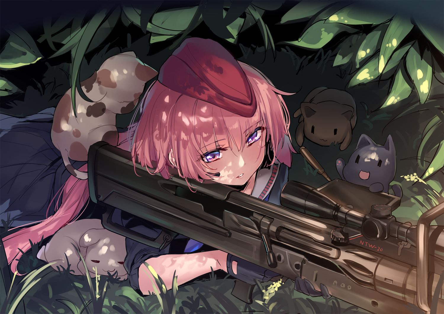 1girl anti-materiel_rifle cartridge cat commentary_request girls'_frontline gloves gun hat ntw-20 ntw-20_(girls'_frontline) pink_hair purple_eyes red_hair rifle sniper_rifle weapon yaguo