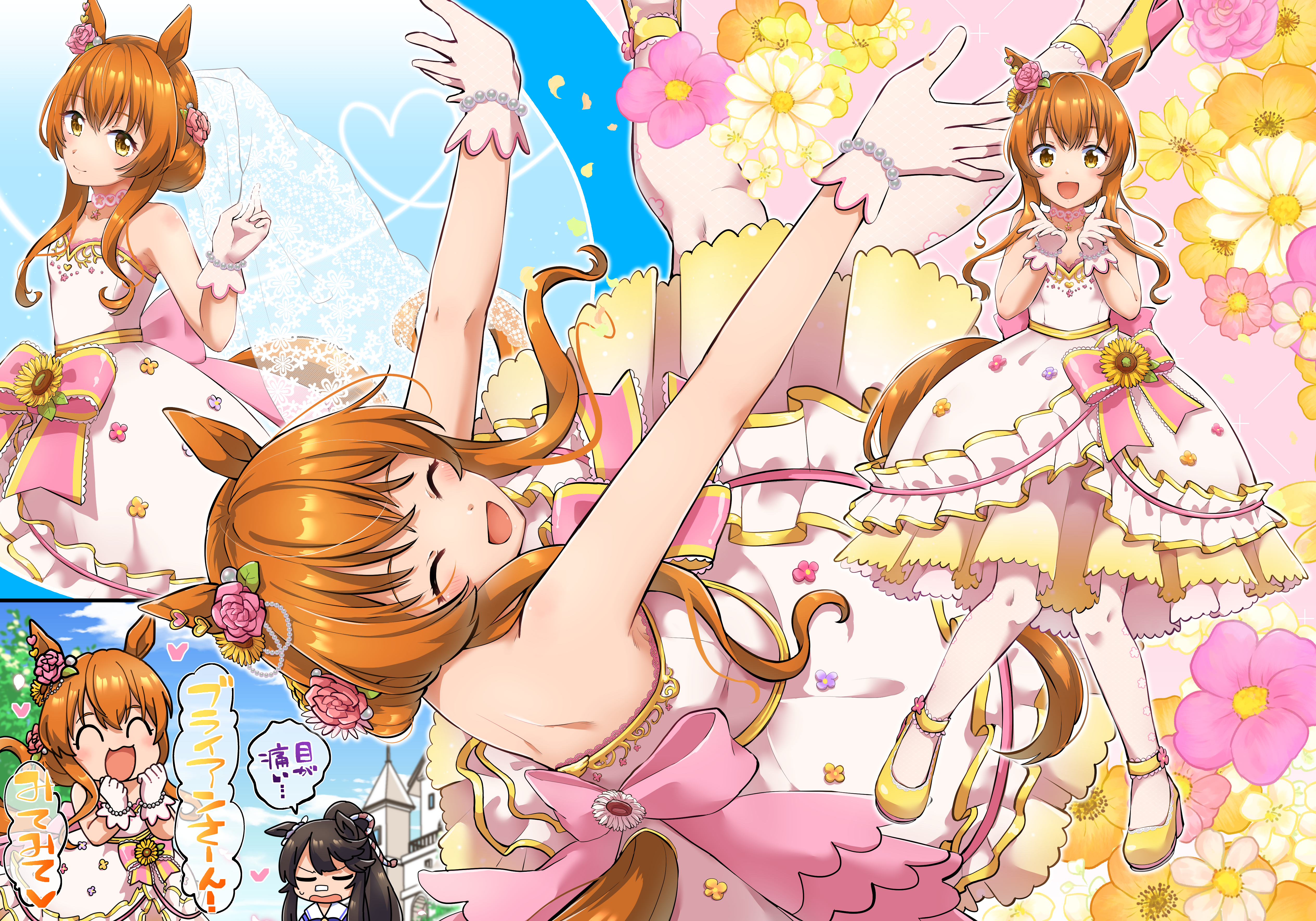 2girls :d =_= ^_^ absurdres animal_ears black_hair blush bow breasts choker closed_eyes dress dress_bow flower gloves hair_flower hair_ornament heart high_heels highres horse_ears horse_girl horse_tail long_hair mayano_top_gun_(june_pride)_(umamusume) mayano_top_gun_(sunlight_bouquet)_(umamusume) mayano_top_gun_(umamusume) mesuga_suki multiple_girls multiple_views narita_brian_(umamusume) open_mouth orange_hair outstretched_arms petticoat pink_dress pink_flower pink_gloves pink_legwear pink_rose rose shoes small_breasts smile solo_focus speech_bubble strapless strapless_dress tail thighhighs translation_request umamusume veil white_legwear yellow_eyes yellow_shoes