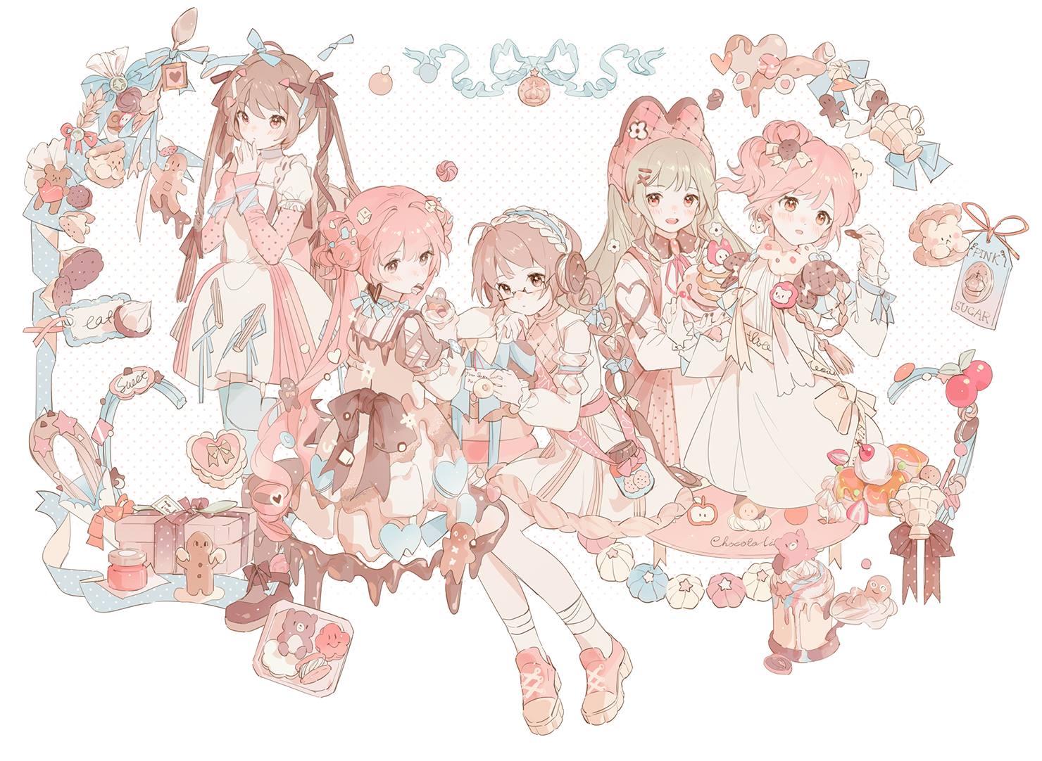 5girls ahoge apple_print balabling blue_legwear bow brown_bow brown_eyes cake cookie detached_sleeves dress food food_print fruit_print glasses hair_bun hair_ornament heart_hair_bun long_hair looking_at_viewer multiple_girls original pancake pastel_colors pink_hair pink_shoes red_eyes shoes short_hair socks souffle_pancake tagme thighhighs thumbprint_cookie twintails x_hair_ornament