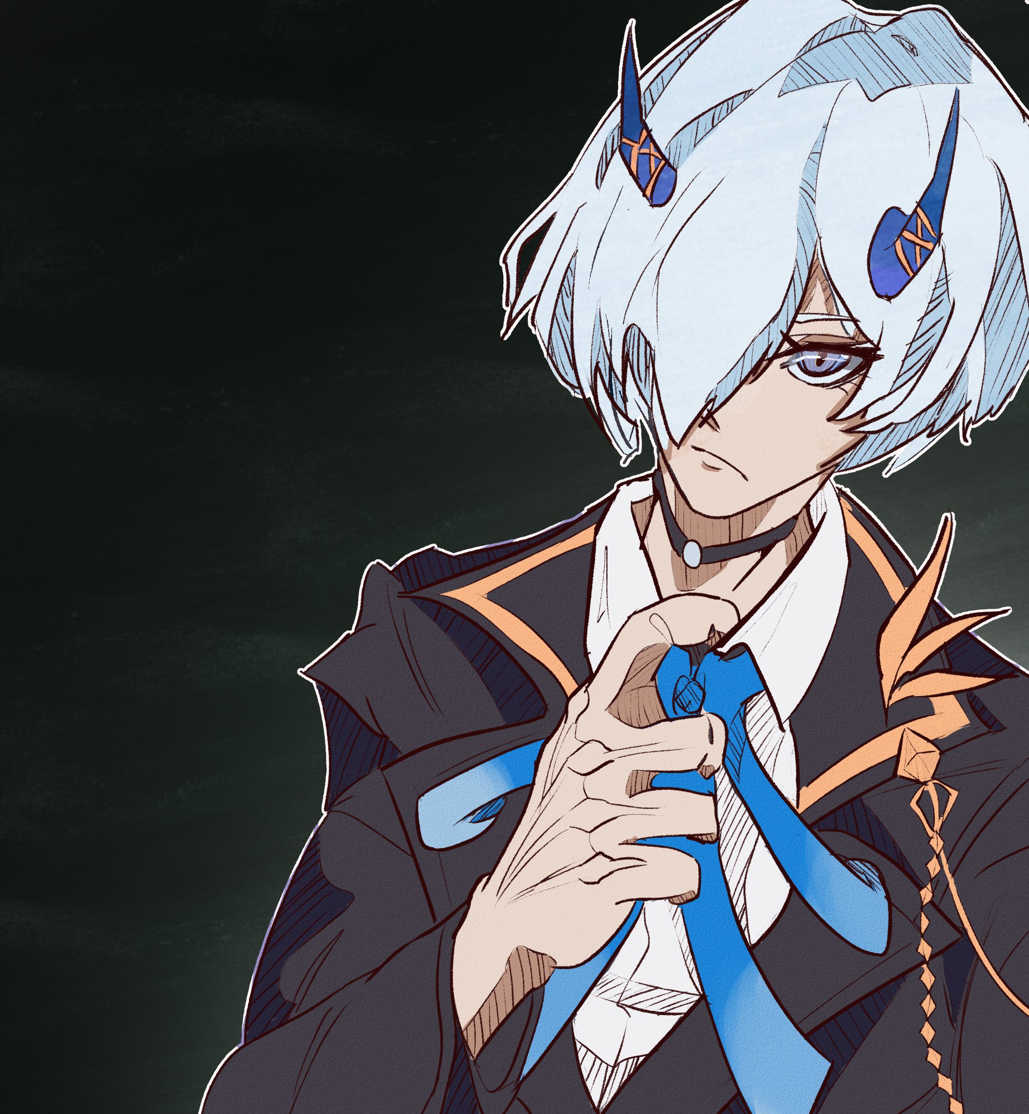 1girl alchemy_stars black_background black_coat black_suit coat formal_clothes highres horns jane_(alchemy_stars) solo suit