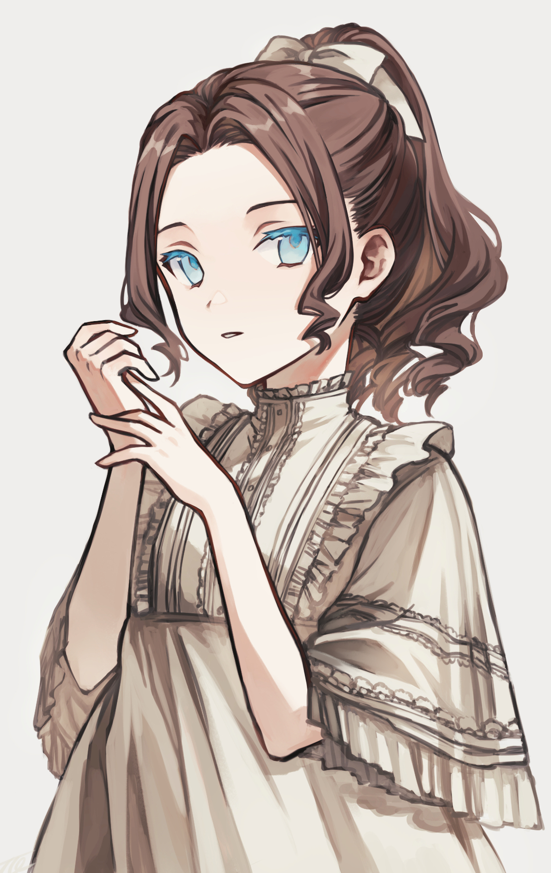 1girl blue_eyes bow brown_hair buttons center_frills colored_eyelashes commentary dress frilled_dress frilled_shirt_collar frilled_sleeves frills grey_background grey_bow grey_dress hair_bow hands_up high_ponytail highres honami_hisame looking_at_viewer medium_hair own_hands_together parted_bangs parted_lips ponytail short_sleeves shoujo_kageki_revue_starlight simple_background solo standing tareko upper_body wavy_hair wide_sleeves