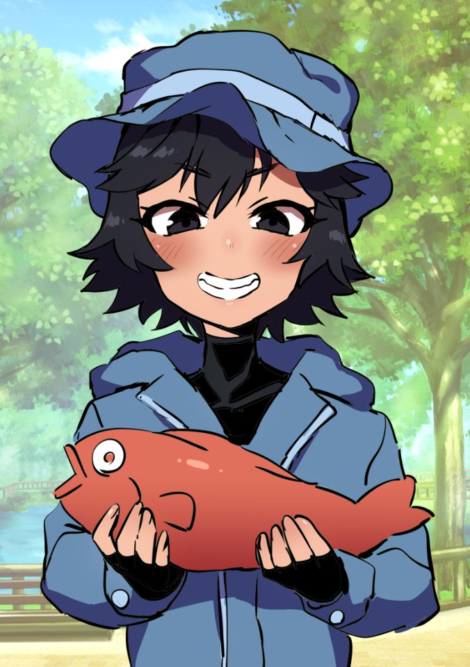 1boy animal black_eyes black_gloves black_hair blue_hat blue_hoodie blush cloud cloudy_sky collarbone commentary_request day etori fingerless_gloves fish gloves grin hat holding holding_animal holding_fish hood hood_down hoodie looking_at_viewer male_focus original outdoors park short_hair sky smile solo trap tree