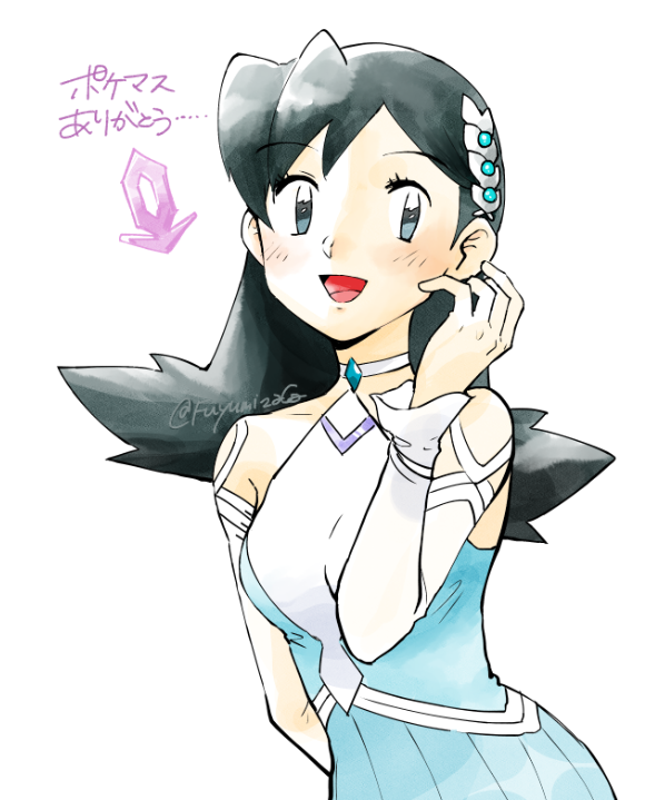 1girl :d black_hair blue_dress blush breasts commentary_request detached_sleeves dress eyelashes fuyumizaka grey_eyes hair_ornament kris_(pokemon) kris_(sygna_suit)_(pokemon) long_hair looking_at_viewer nintendo official_alternate_costume open_mouth pokemon pokemon_masters_ex smile solo tongue translation_request upper_body white_background