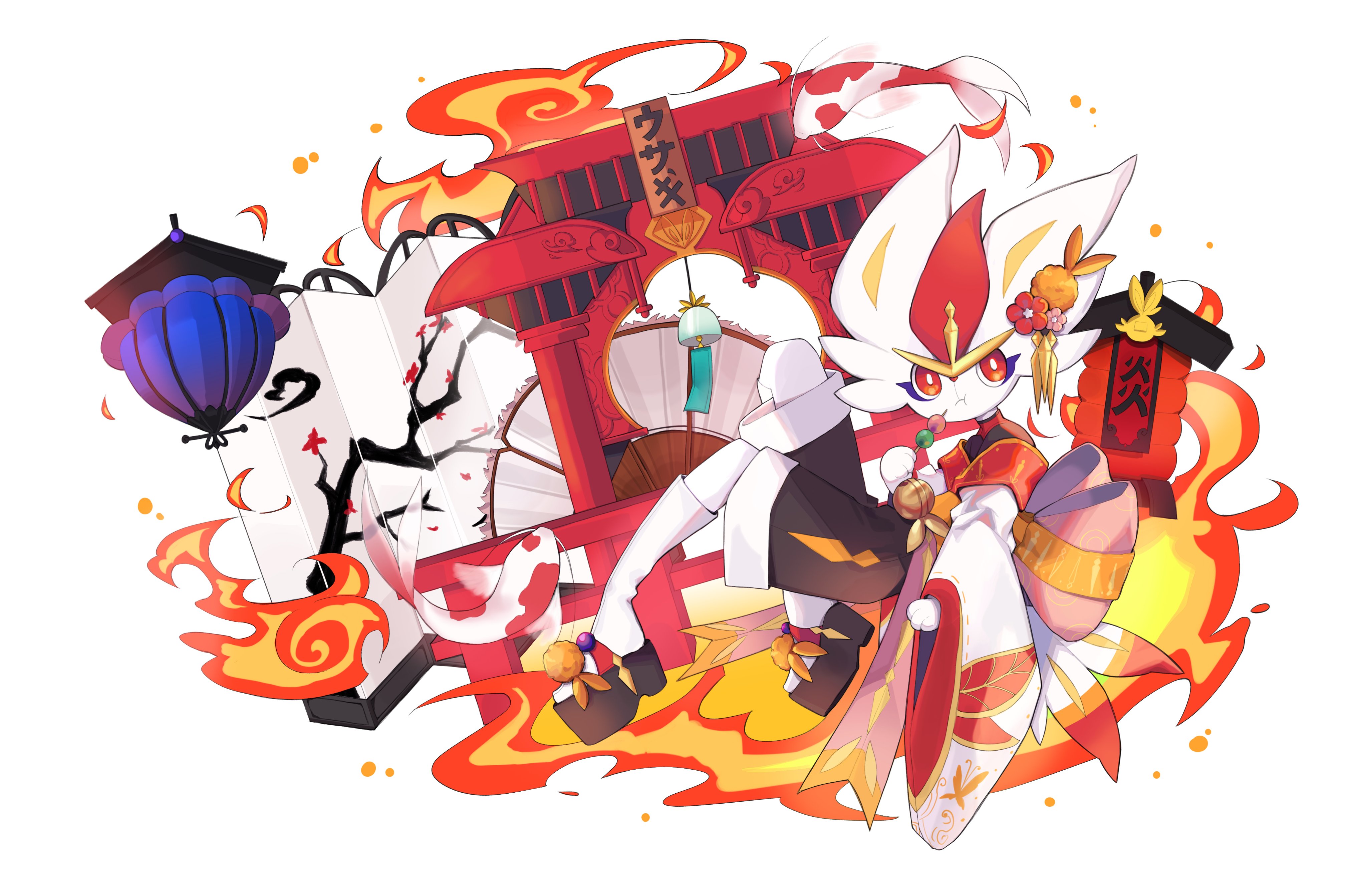 :t absurdres bright_pupils cinderace clothed_pokemon colaoud commentary_request eating fire from_side furry gen_8_pokemon highres holding kneehighs korean_commentary nintendo orange_eyes platform_footwear pokemon pokemon_(creature) shorts socks solo white_pupils white_socks wide_sleeves