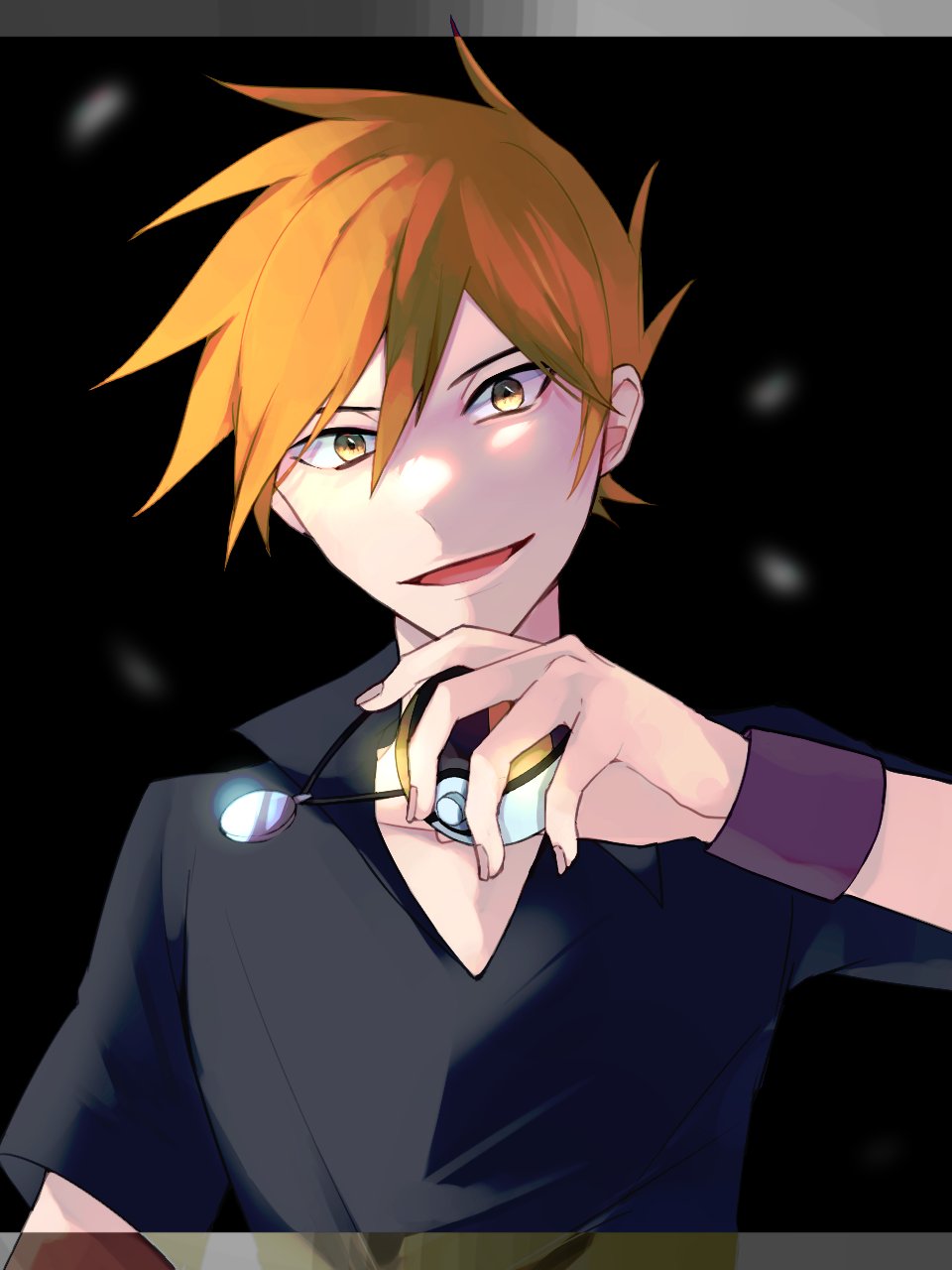 1boy black_background black_shirt blue_oak collared_shirt commentary_request hair_between_eyes highres holding holding_poke_ball jewelry male_focus necklace nintendo norisukep open_mouth orange_hair poke_ball pokemon pokemon_firered_and_leafgreen shirt short_hair smile solo spiked_hair tongue ultra_ball upper_body wristband yellow_eyes
