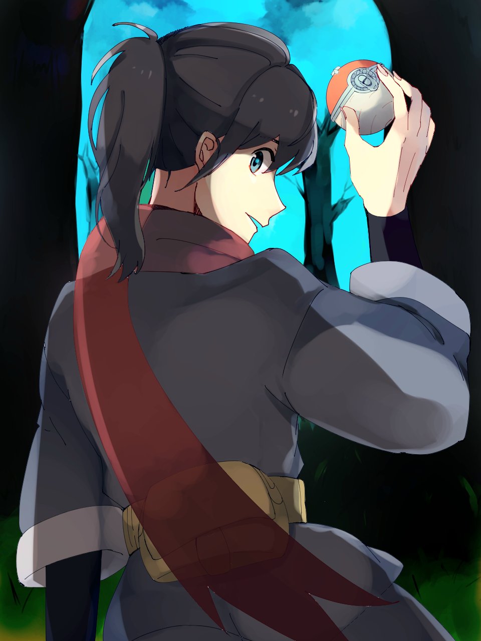 1boy bag black_hair black_shirt blue_eyes commentary_request fanny_pack from_behind grey_jacket hand_up highres hisuian_poke_ball holding holding_poke_ball jacket looking_back male_focus nintendo norisukep open_mouth poke_ball pokemon pokemon_legends:_arceus ponytail red_scarf rei_(pokemon) scarf shirt solo yellow_bag