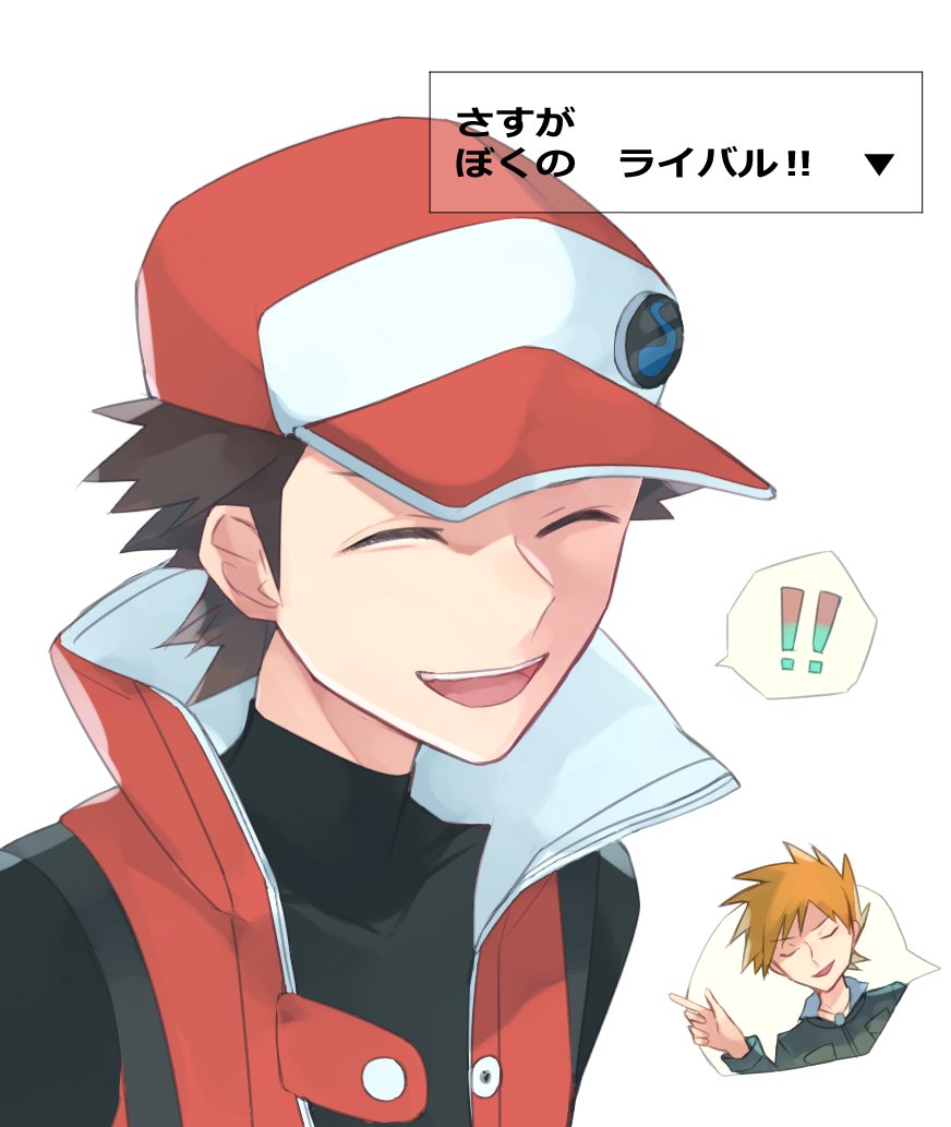 ! !! 2boys :d black_shirt blue_oak brown_hair closed_eyes coat commentary_request covered_collarbone dialogue_box hat male_focus multiple_boys nintendo norisukep open_mouth pokemon pokemon_heartgold_and_soulsilver pokemon_masters_ex red_(pokemon) red_(sygna_suit)_(pokemon) red_coat red_headwear shirt short_hair sleeveless sleeveless_coat smile spoken_character teeth tongue translated upper_teeth_only video_game_dialogue_box white_background