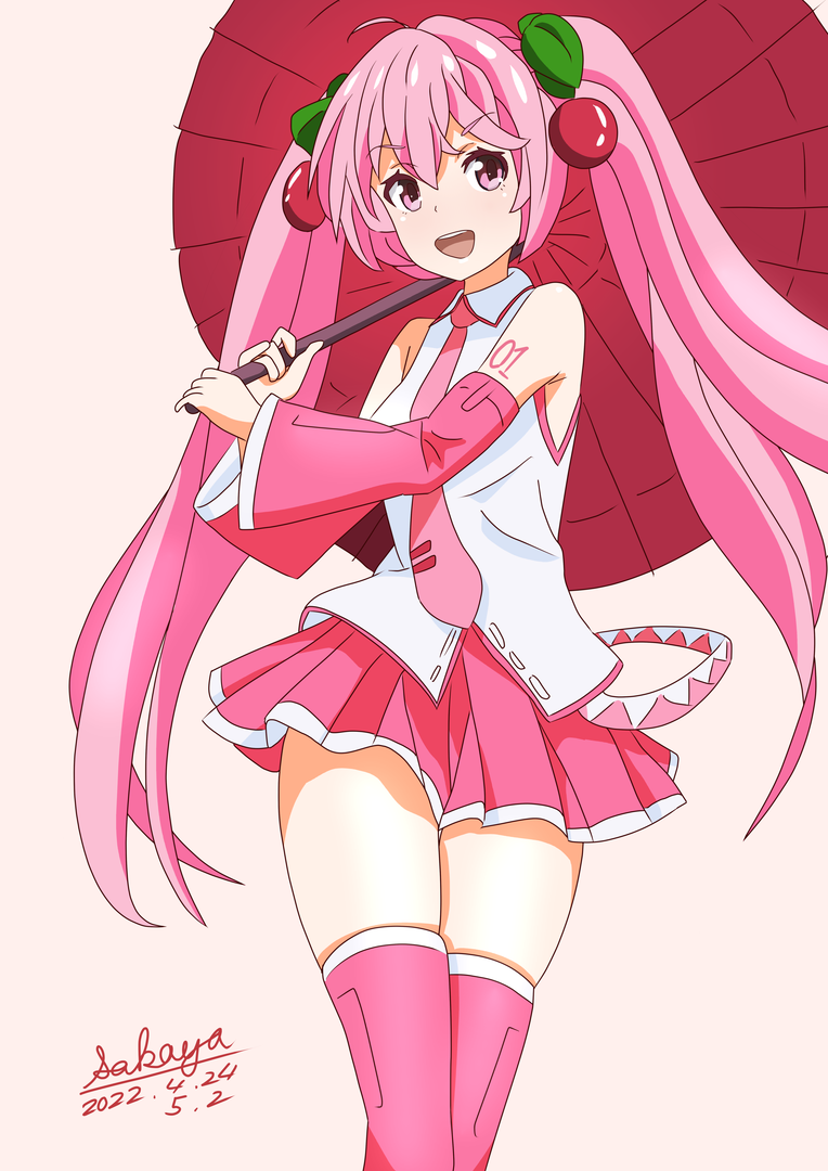 1girl :d bare_shoulders breasts brown_background cherry_hair_ornament collared_shirt commentary dated derivative_work detached_sleeves food-themed_hair_ornament hair_between_eyes hair_ornament hatsune_miku holding holding_umbrella long_hair long_sleeves looking_at_viewer necktie oil-paper_umbrella open_mouth pink_eyes pink_hair pink_necktie pink_skirt pink_sleeves pink_thighhighs pleated_skirt red_umbrella revision sakayaya sakura_miku shirt signature simple_background skirt sleeveless sleeveless_shirt small_breasts smile solo teeth thighhighs tie_clip twintails umbrella upper_teeth_only v-shaped_eyebrows very_long_hair vocaloid white_shirt wide_sleeves