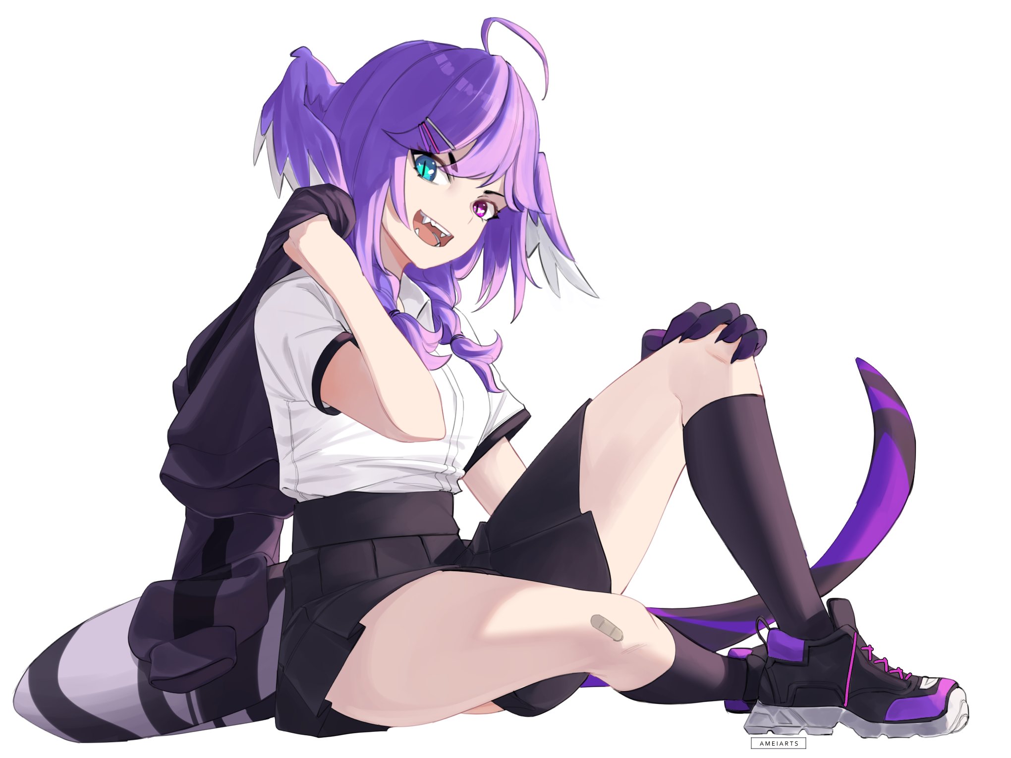 1girl ameiarts bandaid bandaid_on_leg black_shoes black_skirt black_socks black_sweater blue_eyes braid dragon_girl dragon_tail dress_shirt eyelashes eyes_visible_through_hair fangs head_wings heterochromia highres looking_at_viewer medium_hair nijisanji nijisanji_en open_mouth pointy_ears purple_eyes purple_hair purple_wings school_uniform selen_tatsuki shirt shoes short_sleeves signature sitting skirt smile sneakers socks solo sweater tail thighs twin_braids untied_shoelaces virtual_youtuber white_background white_shirt wings