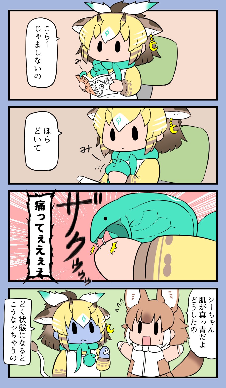 2girls animal_ears bandages biting blue_skin bokoboko_(pandagapanda1) book colored_skin crescent crescent_earrings dhole_(kemono_friends) dog_ears dog_girl dog_tail earrings empty_eyes extra_ears fangs fangs_out giraffe_ears giraffe_girl giraffe_horns highres holding holding_book horns jewelry kemono_friends kemono_friends_3 multiple_girls open_book poisoned reading sivatherium_(kemono_friends) snake snake_tail tail