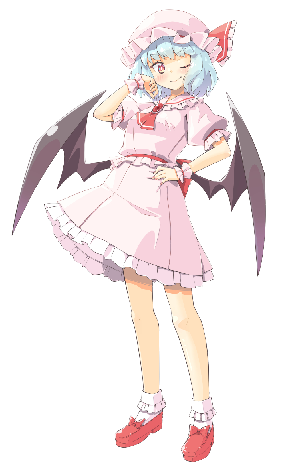1girl arnest ascot bat_wings blue_hair blush collared_shirt frilled_shirt_collar frills full_body hat highres looking_at_viewer low_wings mob_cap one_eye_closed puffy_short_sleeves puffy_sleeves red_ascot red_eyes remilia_scarlet shirt short_hair short_sleeves smile solo standing touhou white_background wings wrist_cuffs
