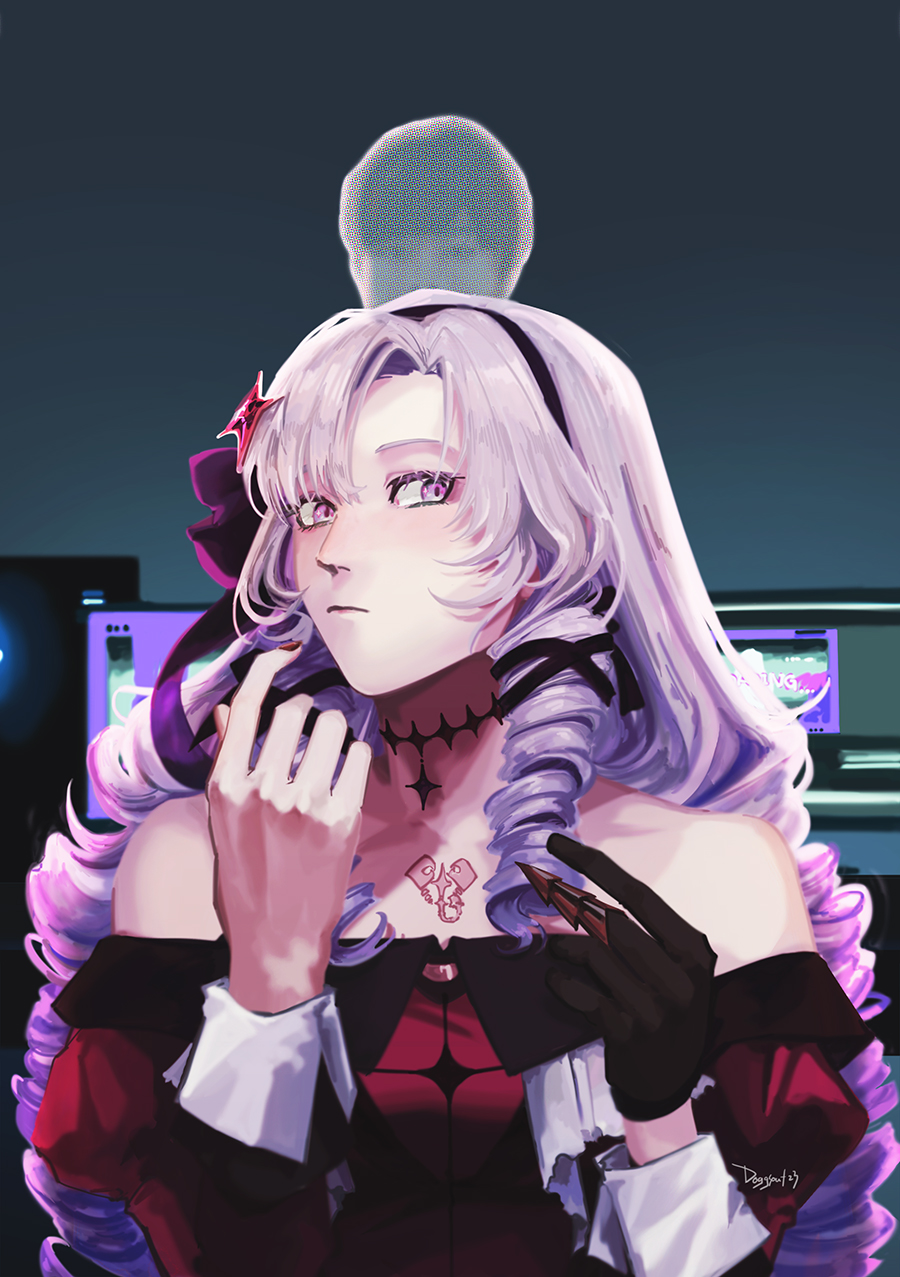 1boy 1girl black_bow black_gloves black_hairband blush bow collarbone dress drill_hair eyebrows_hidden_by_hair gloves hair_bow hairband highres hyakumantenbara_salome hyakumantenbara_salome_(1st_costume) long_hair looking_at_viewer looking_to_the_side nijisanji off-shoulder_dress off_shoulder purple_eyes purple_hair red_dress solo_focus tazumi_riku virtual_youtuber welldoneegg
