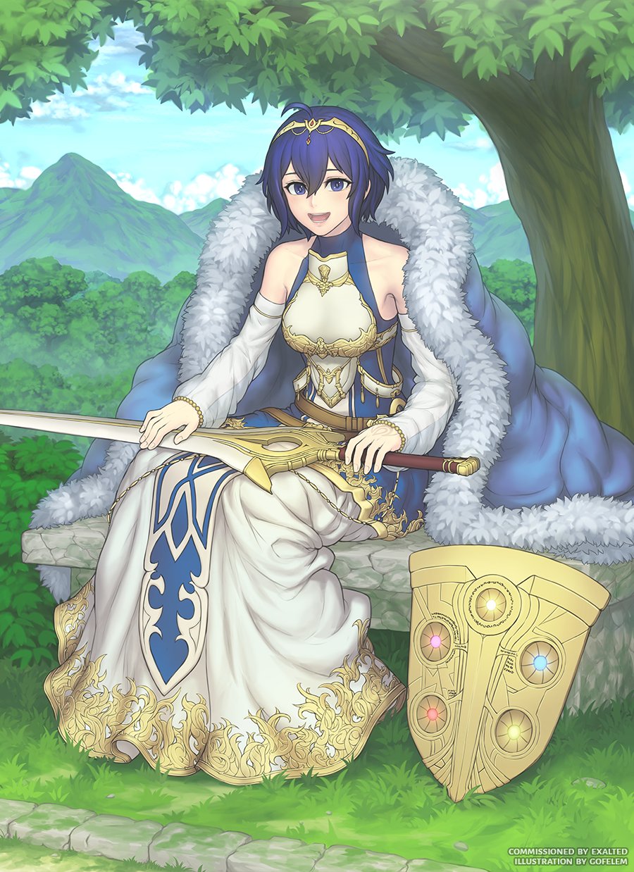 1girl ahoge armor armored_dress artist_name bare_shoulders belt bench blue_eyes blue_hair breastplate breasts commission day detached_sleeves dress fire_emblem fire_emblem_awakening forest full_body gofelem grass hair_between_eyes hand_tattoo highres holding holding_sword holding_weapon looking_at_viewer lucina_(fire_emblem) lucina_(hope-ruling_queen)_(fire_emblem) medium_breasts female_morgan_(fire_emblem) mountain nature nintendo on_bench open_mouth outdoors see-through_clothes see-through_sleeves shield short_hair sitting solo sword tattoo teeth tongue tree watermark weapon