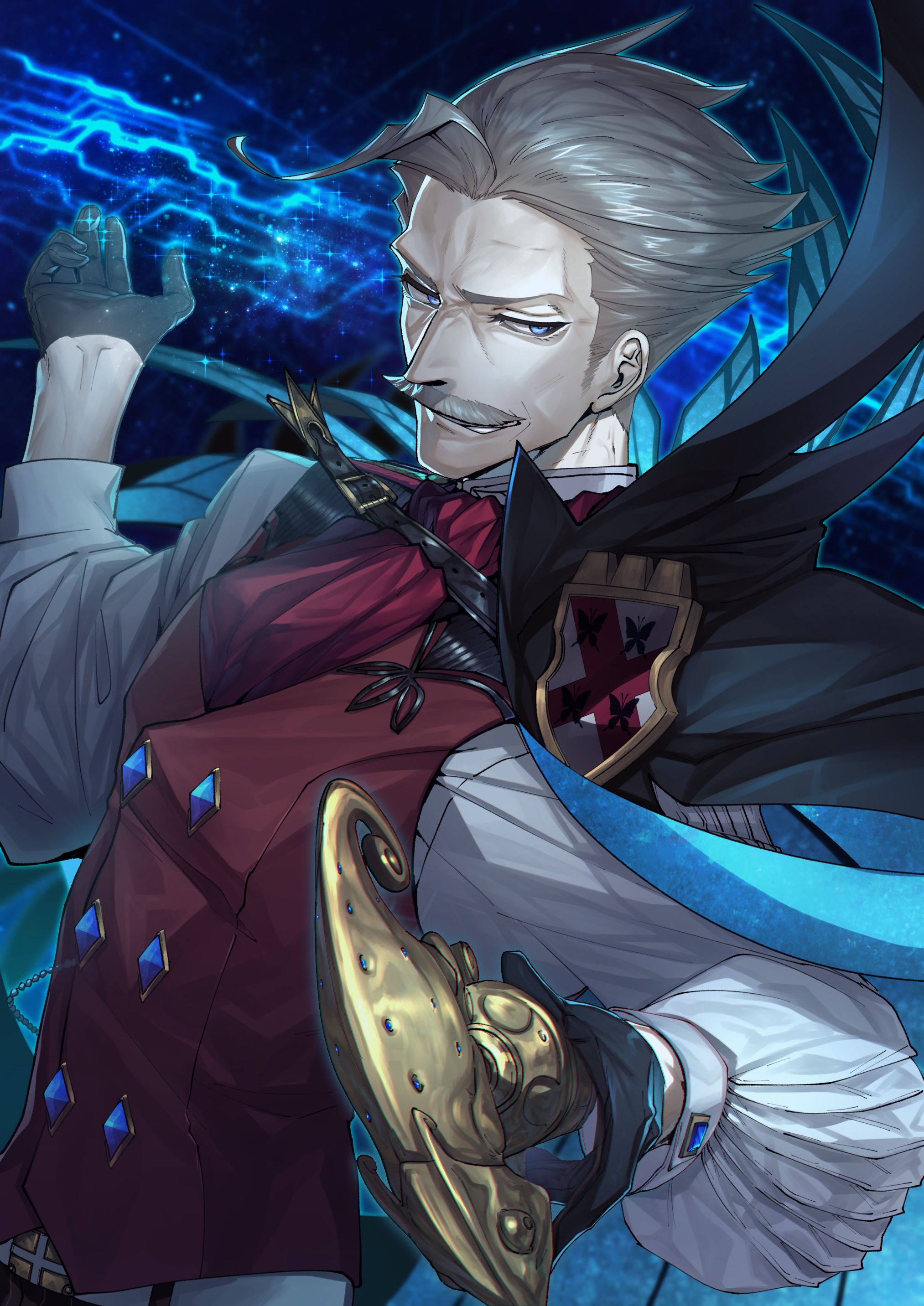 1boy absurdres black_gloves blue_eyes cape commentary_request facial_hair fate/grand_order fate_(series) formal_clothes gloves grey_hair highres holding holding_stick james_moriarty_(archer)_(fate) long_sleeves looking_at_viewer male_focus mustache old old_man short_hair smile solo sparkle stick suzuki_rui upper_body vest