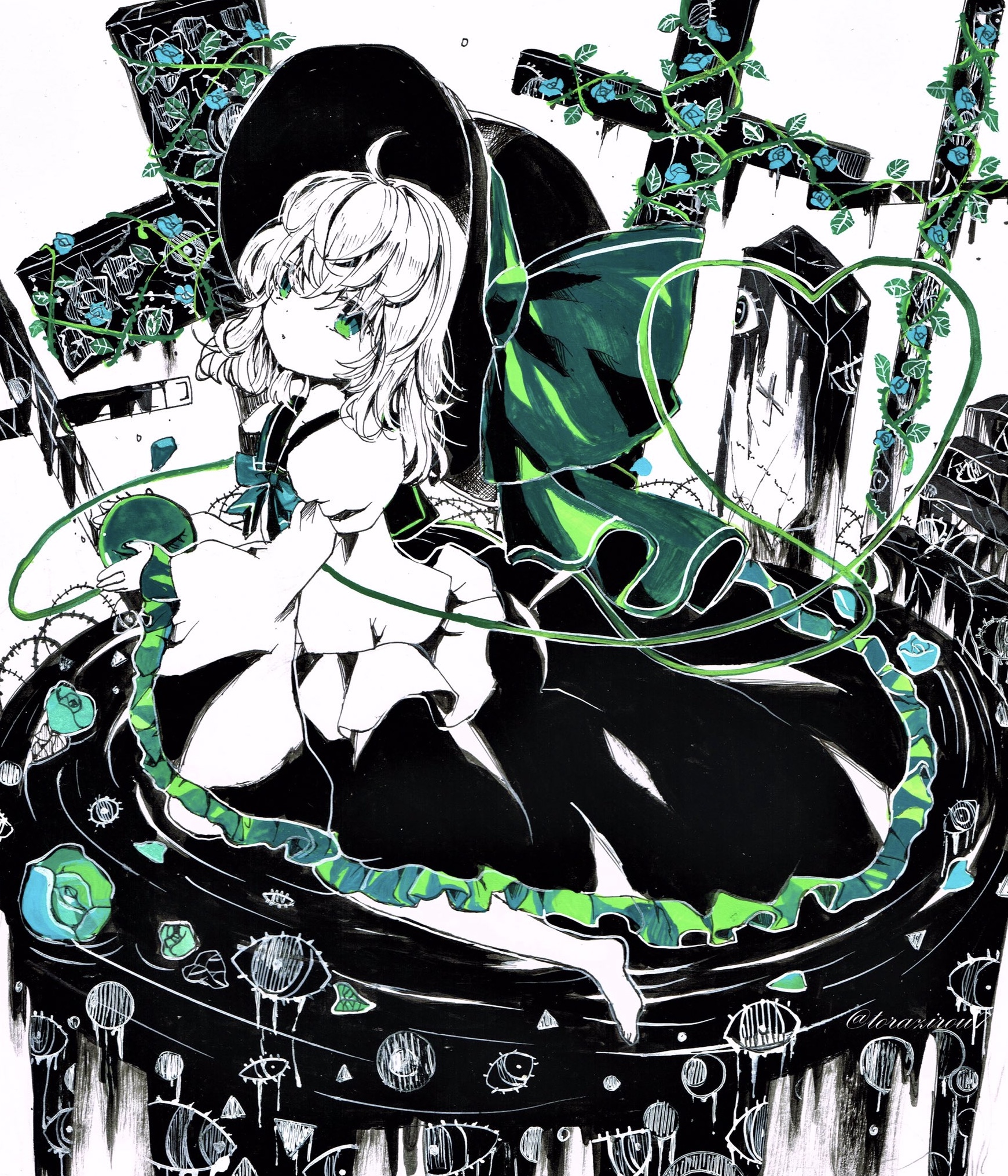 1girl acrylic_paint_(medium) ahoge blouse blue_bow blue_bowtie blue_flower blue_rose bow bowtie closed_mouth commentary cross flower frilled_skirt frilled_sleeves frills from_side full_body green_eyes green_ribbon hair_between_eyes hat hat_ribbon heart heart_of_string highres holding komeiji_koishi latin_cross long_sleeves looking_at_viewer looking_to_the_side medium_hair painting_(medium) partially_colored plant puffy_sleeves ribbon rose shirt skirt solo third_eye thorns torajirou_(toraneko_zirou) touhou traditional_media twitter_username vines wide_sleeves