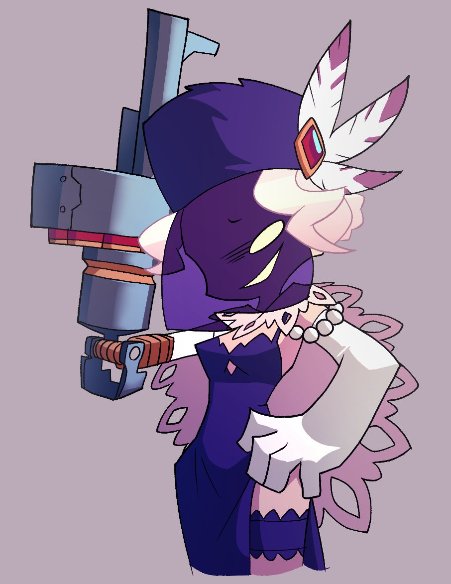 1girl ammunition amputee arm_cannon black_dahlia blank_eyes cowboy_shot dress elbow_gloves explosive feathers frilled_thigh_strap fur_hat gloves grenade grenade_cartridge grenade_launcher grin gun hand_on_own_hip hat parody phishtickz prosthesis prosthetic_arm purple_background skullgirls smile solo style_parody thigh_strap veil weapon white_eyes white_hair