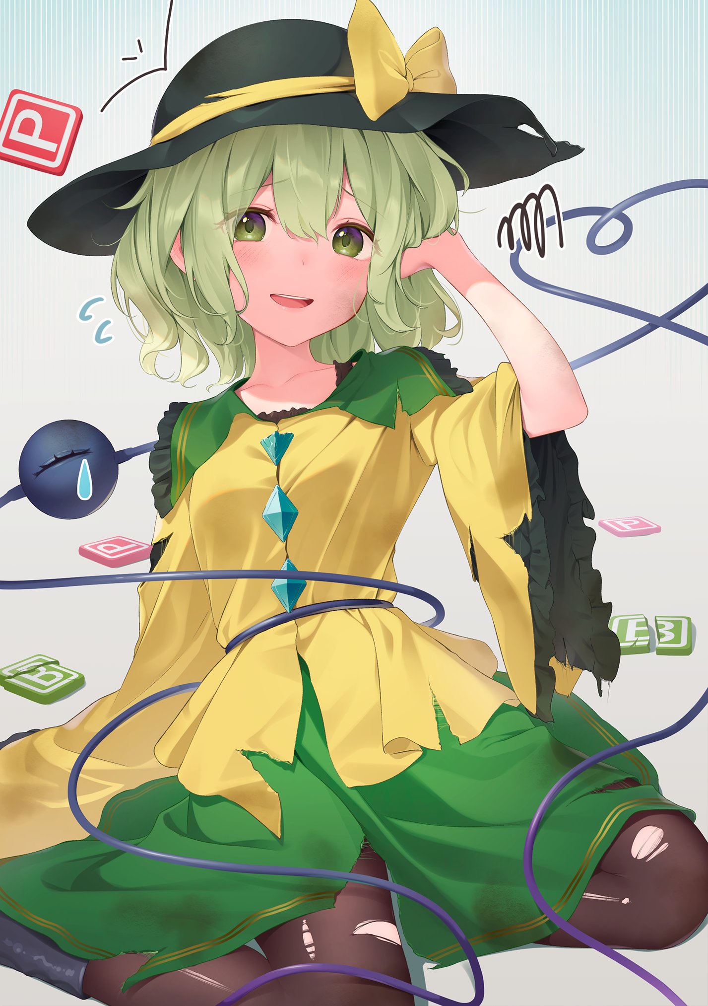 1girl :d black_hat black_pantyhose blush bomb_item_(touhou) bow frilled_shirt_collar frills green_eyes green_hair green_skirt grey_background hair_between_eyes hat hat_bow heart heart_of_string highres kanpa_(campagne_9) komeiji_koishi long_sleeves looking_at_viewer open_mouth pantyhose power-up shirt short_hair simple_background sitting skirt smile solo third_eye torn_clothes torn_pantyhose touhou wide_sleeves yellow_bow yellow_shirt yokozuwari