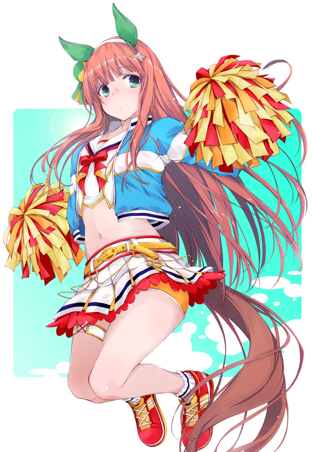 1girl animal_ears blue_jacket cheerleader commentary_request cosplay cropped_jacket full_body green_eyes hime_cut holding holding_pom_poms horse_ears horse_girl horse_tail jacket jumping long_hair looking_at_viewer midriff nice_nature_(run&win)_(umamusume) nice_nature_(umamusume) nice_nature_(umamusume)_(cosplay) orange_hair pleated_skirt pom_pom_(cheerleading) pom_poms short_shorts shorts silence_suzuka_(umamusume) skirt solo tail umamusume white_skirt yumesato_makura