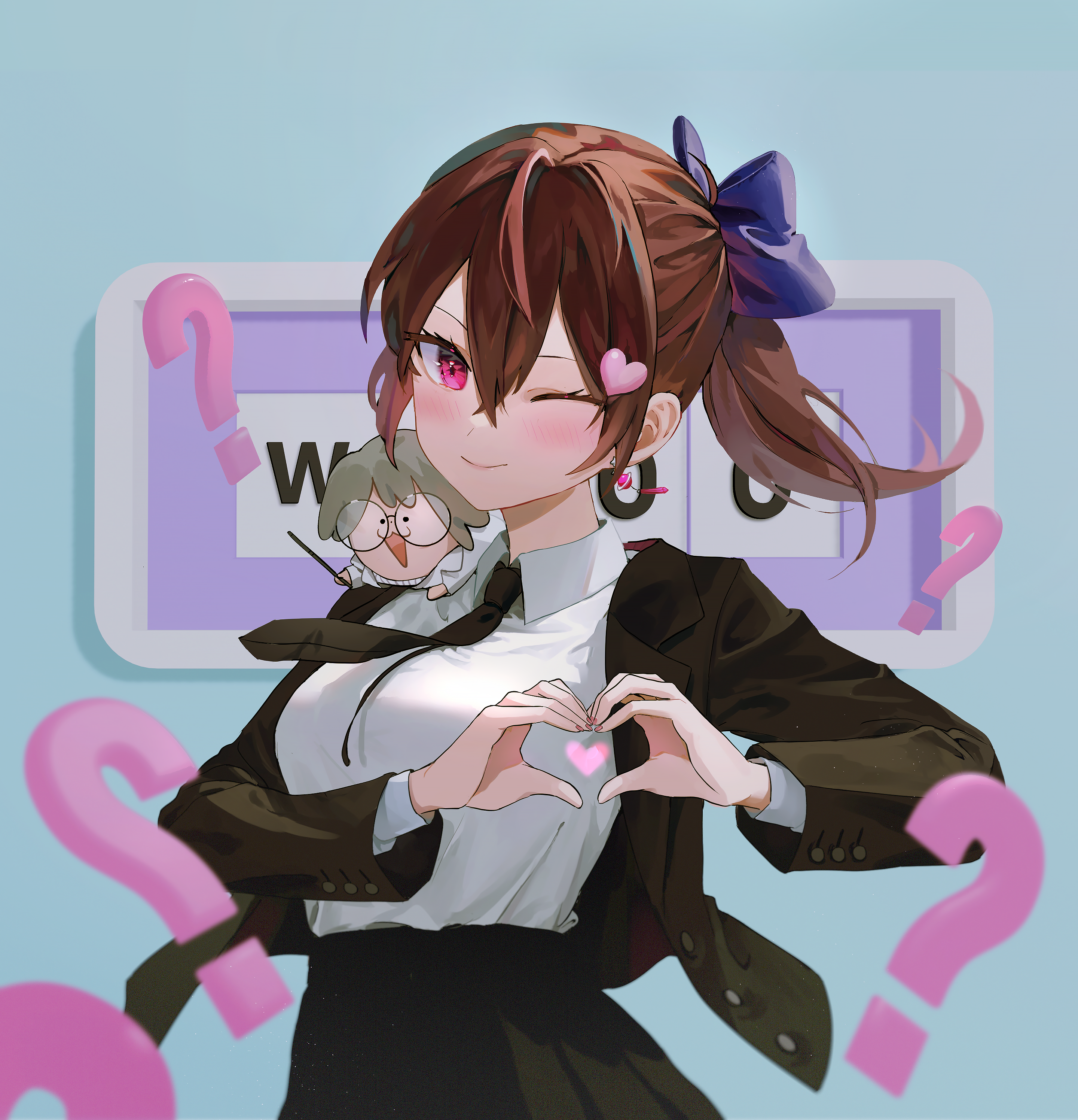 1girl ;) ? absurdres black_jacket black_necktie black_skirt blazer blue_bow blush bow brown_hair cccc2445 collared_shirt commentary_request dress_shirt hair_between_eyes heart heart_hands highres jacket jururu korean_commentary lapels long_hair long_sleeves looking_at_viewer necktie notched_lapels one_eye_closed pleated_skirt ponytail purple_eyes school_uniform shirt skirt smile virtual_youtuber waktaverse white_shirt wind