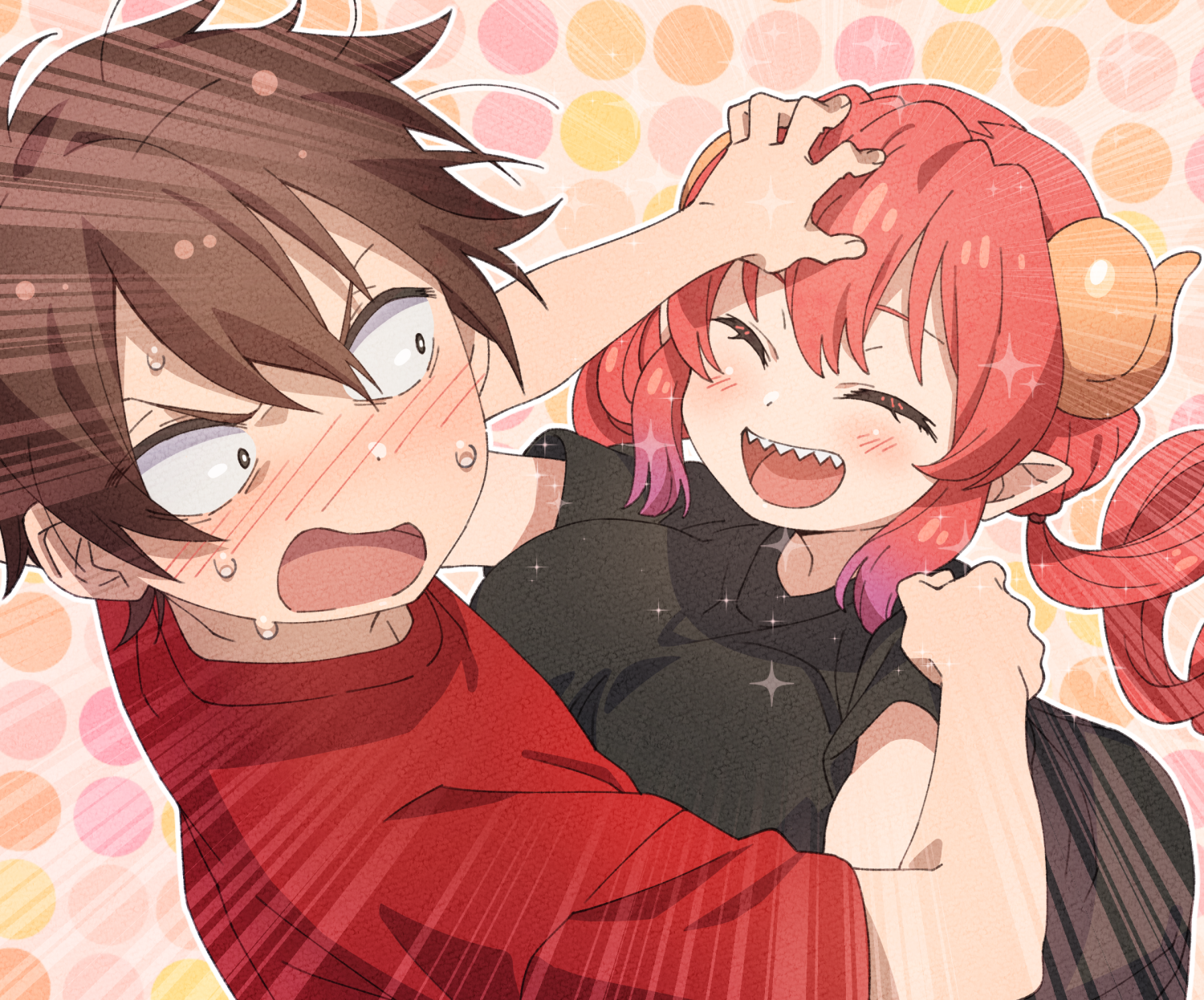 1boy 1girl aida_taketo artist_request black_shirt blush breasts brown_hair closed_eyes constricted_pupils curled_horns dress_shirt drill_hair hand_on_another's_head happy highres horns huge_breasts ilulu_(maidragon) kobayashi-san_chi_no_maidragon long_hair open_mouth pointy_ears polka_dot polka_dot_background purple_hair red_hair red_shirt sharp_teeth shirt short_sleeves smile sweat t-shirt teeth twin_drills upper_teeth_only