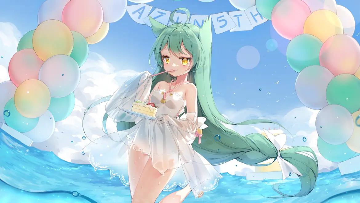 ahoge akashi_(azur_lane) animal_ears azur_lane balloon bare_shoulders blue_sky braid cake cat_ears cat_girl dress food green_hair long_hair long_sleeves low-braided_long_hair low-tied_long_hair maya_g ocean see-through_clothes see-through_dress sky solo spoon utensil_in_mouth very_long_hair water water_drop white_dress yellow_eyes
