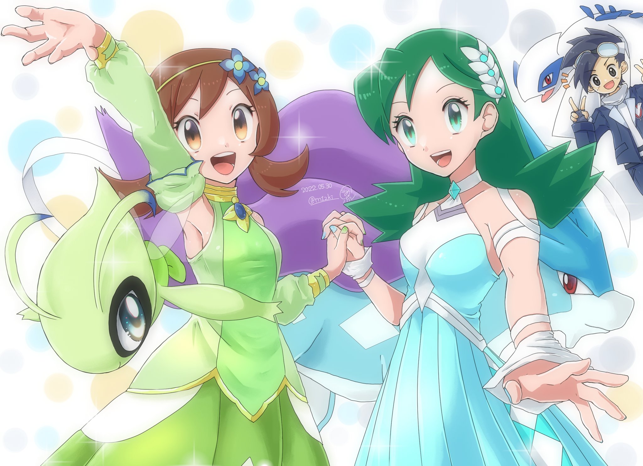 1boy 2girls aqua_dress aqua_eyes aqua_hair bare_shoulders blue_flower breasts brown_eyes brown_hair celebi choker collarbone detached_sleeves dress ethan_(pokemon) ethan_(sygna_suit)_(pokemon) flower gen_2_pokemon green_dress hair_flower hair_ornament halter_dress halterneck highres holding_hands kris_(pokemon) kris_(sygna_suit)_(pokemon) legendary_pokemon long_sleeves lugia lyra_(pokemon) lyra_(sygna_suit)_(pokemon) m12ki medium_hair multiple_girls mythical_pokemon nintendo official_alternate_costume pilot_suit pokemon pokemon_masters_ex scarf shorts shorts_under_dress side_slit small_breasts suicune twintails v white_background wrist_cuffs