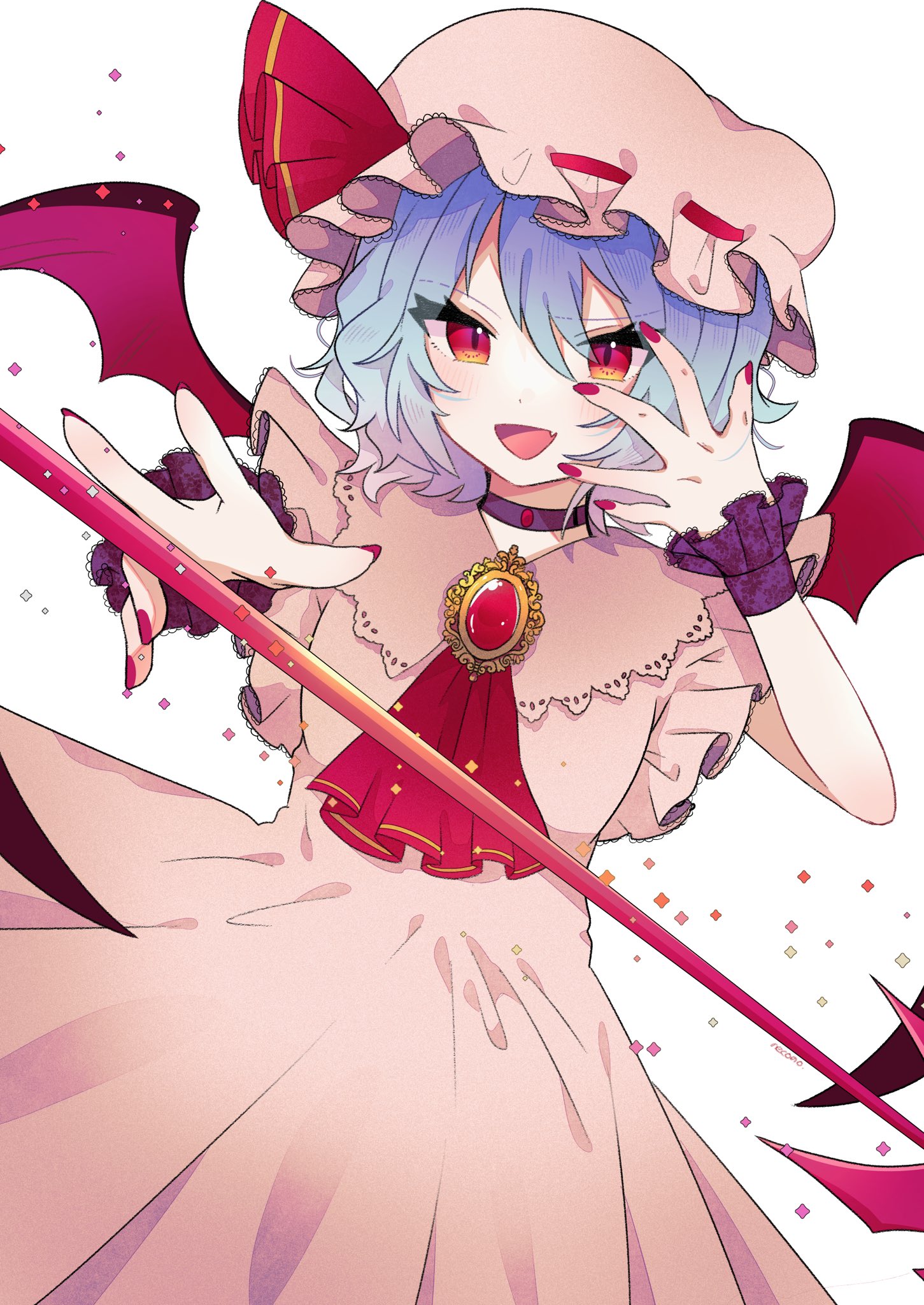 1girl arms_up ascot bat_wings blue_hair blush choker commentary_request confetti dress eyes_visible_through_hair fang fingernails gem hair_between_eyes hands_up hat hat_ribbon highres jewelry long_fingernails mob_cap nail_polish necono_(nyu6poko) open_mouth pink_dress pink_hat polearm purple_choker purple_nails red_ascot red_gem red_ribbon remilia_scarlet ribbon short_hair short_sleeves simple_background smile solo spear spear_the_gungnir standing star_(symbol) tongue touhou weapon white_background wings wrist_cuffs