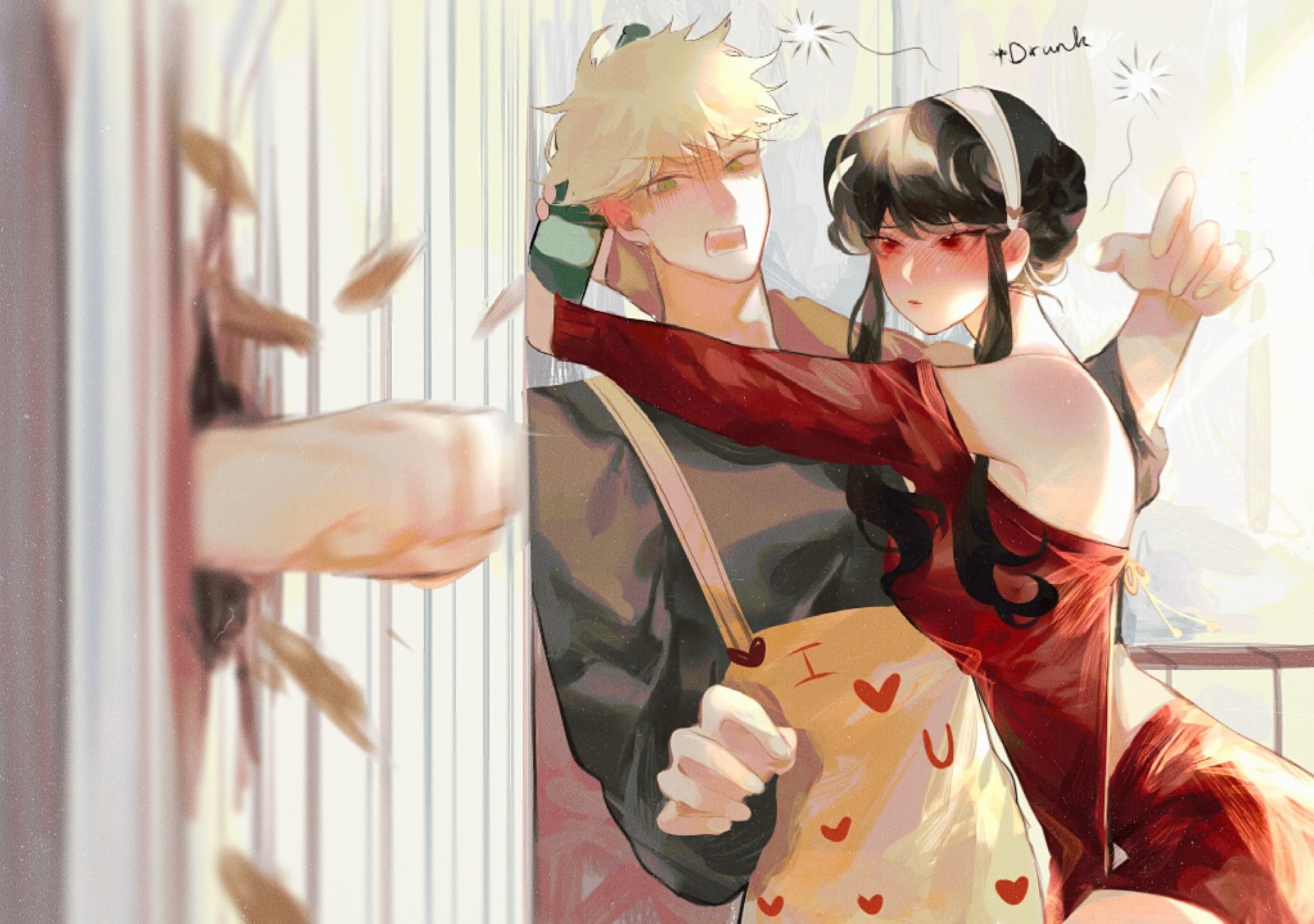 1boy 1girl blonde_hair blush bottle breaking commentary crack dress drunk english_commentary here's_johnny!_(meme) highres husband_and_wife long_sleeves looking_to_the_side meme motion_blur off-shoulder_dress off_shoulder open_mouth red_eyes spy_x_family squeans surprised sweater sweater_dress the_shining twilight_(spy_x_family) wine_bottle yionyi23 yor_briar