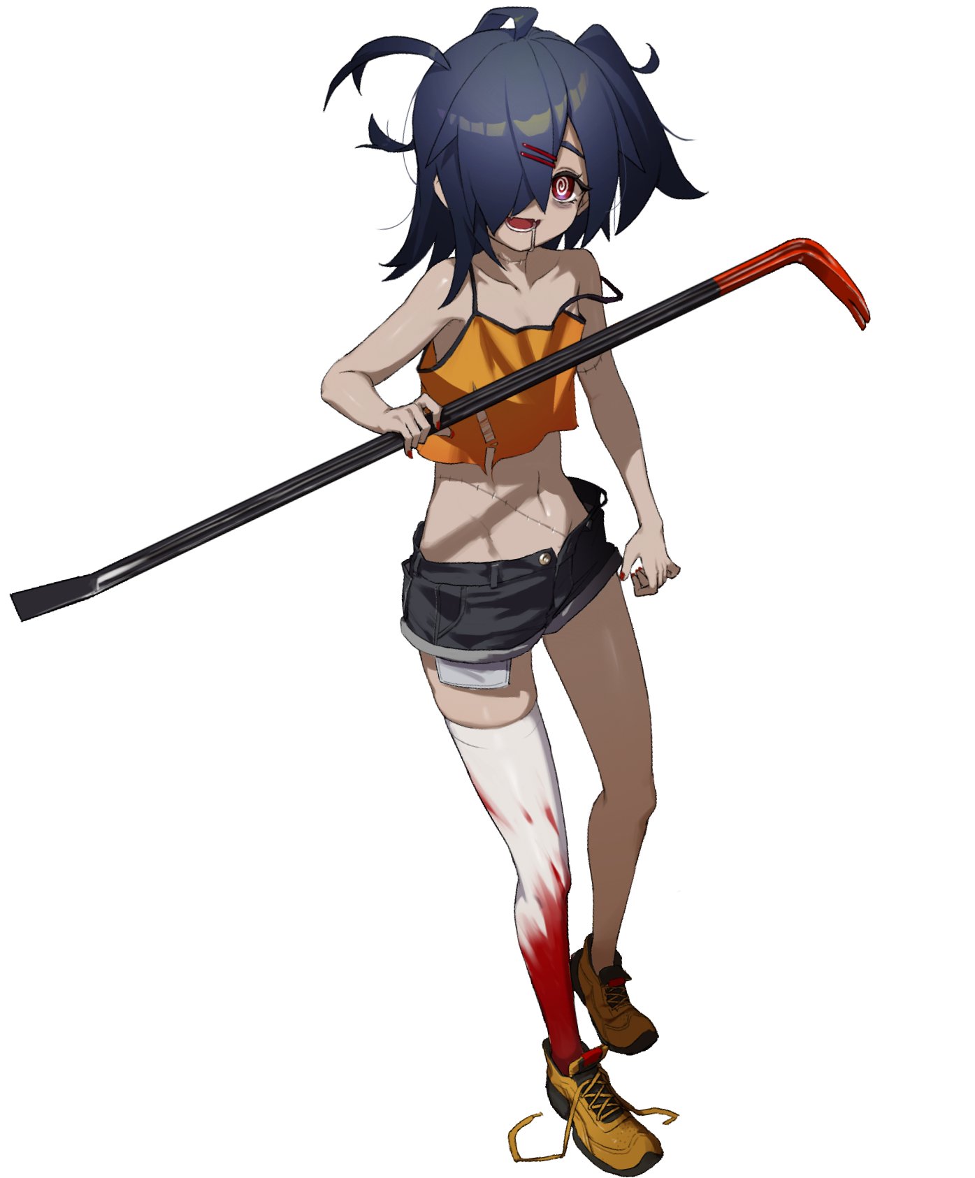 1girl @_@ bags_under_eyes bare_shoulders black_shorts blood blood_on_clothes blue_hair bright_pupils crowbar drooling fang fingernails grey_background hair_ornament hair_over_one_eye hairclip hara_shoutarou highres holding holding_crowbar holding_weapon horror_(theme) long_hair lower_teeth_only messy_hair nail_polish navel open_mouth orange_shoes original red_eyes red_nails saliva scar scar_on_stomach shoes short_shorts shorts side_ponytail simple_background single_thighhigh skin_fang skindentation sneakers solo stitches teeth thighhighs tongue torn torn_clothes weapon white_pupils white_thighhighs